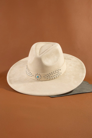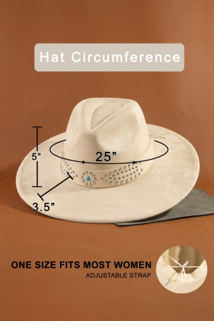 - This fedora hat displays a vibrant western studded strap faux suede style. Elevate your ensemble with this chic, timeless fedora hat.