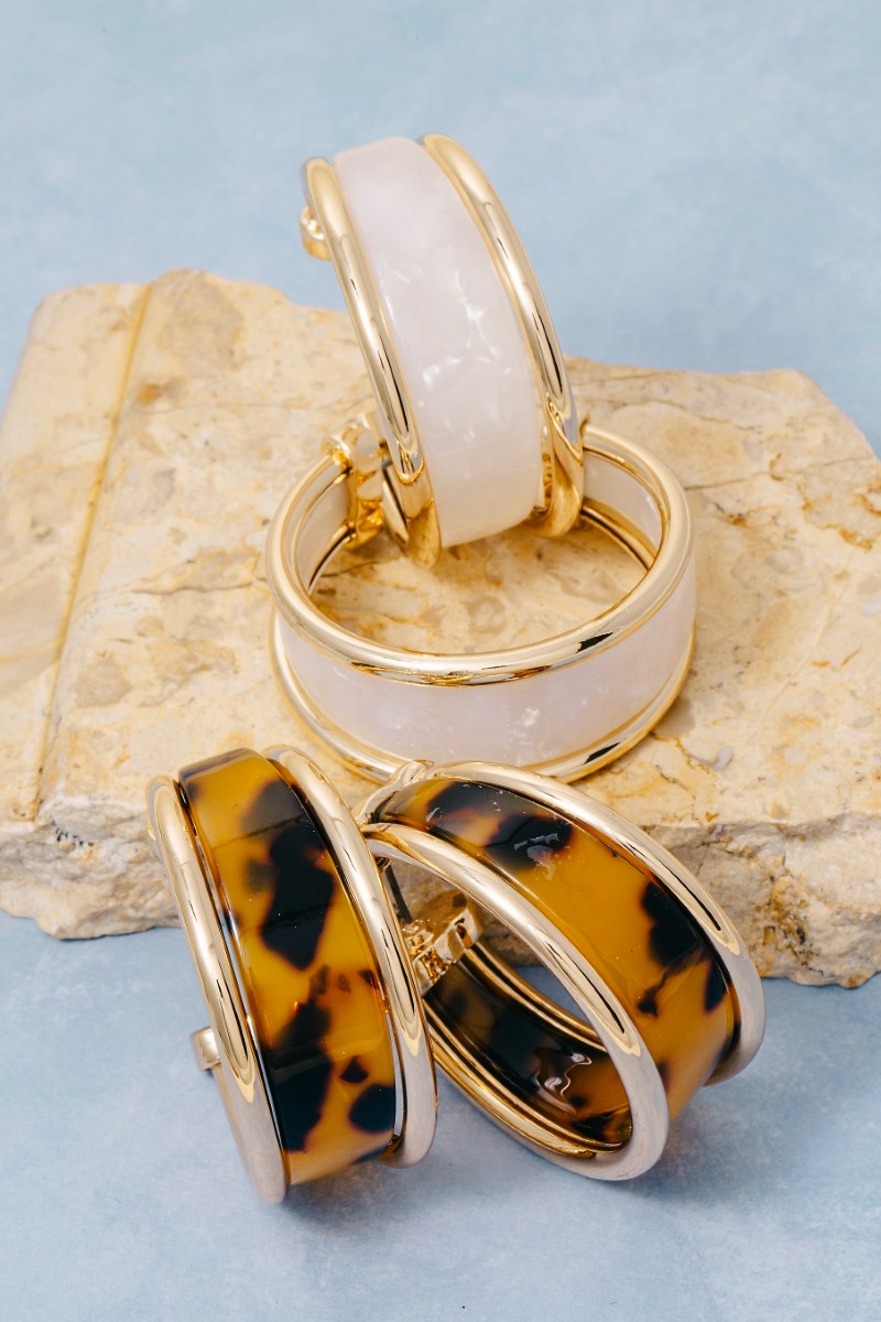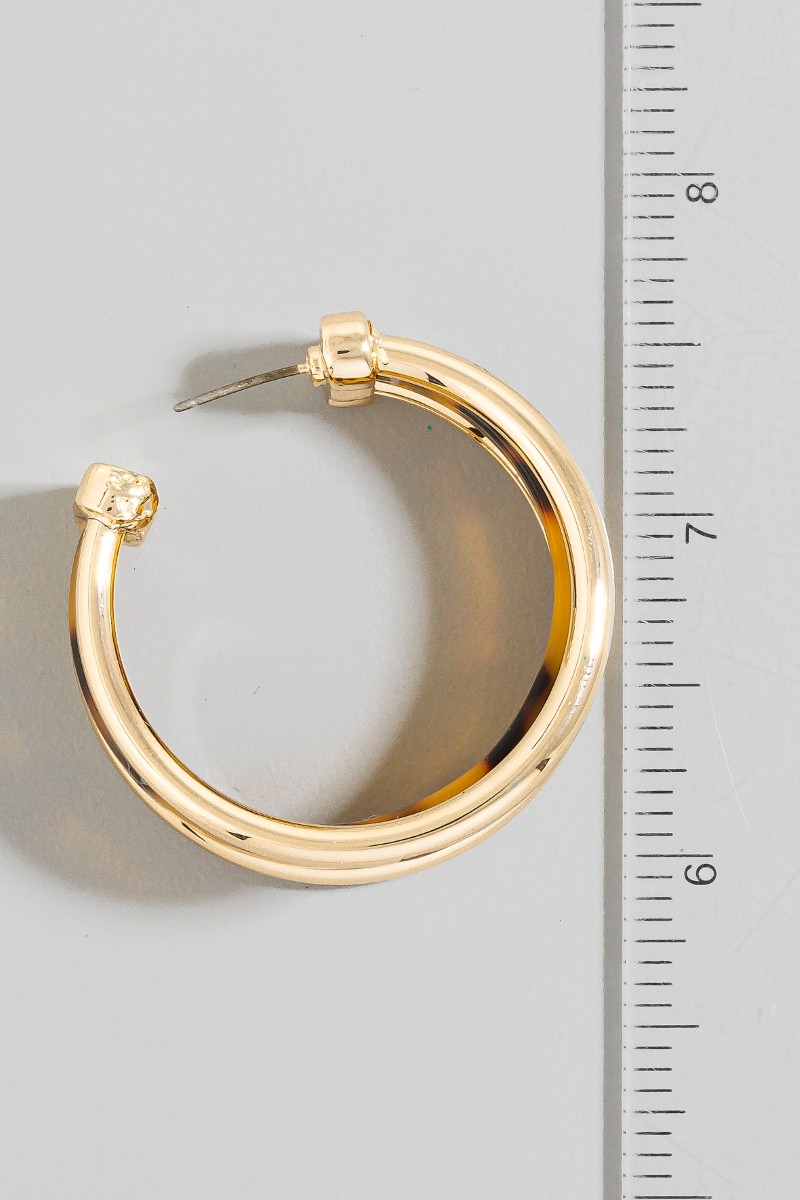 - This pair of hoop earrings showcases a unique wide acetate and metallic trim style. Celebrate the art of accessorizing with this piece that effortlessly encapsulates modern trends.