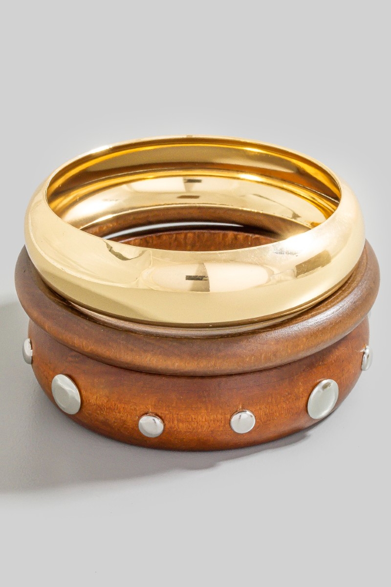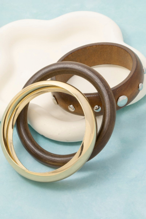 • This bangle bracelet introduces a stunning wood and metallic set style. Experience the joy of accessorizing with this piece that effortlessly combines versatility and charm.