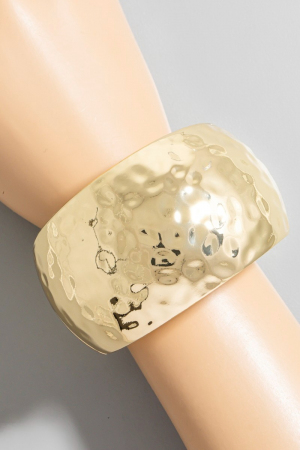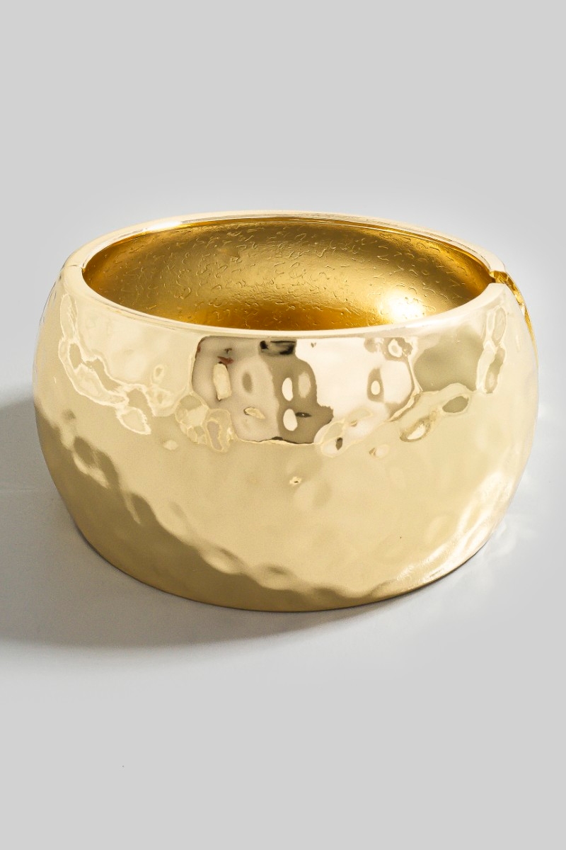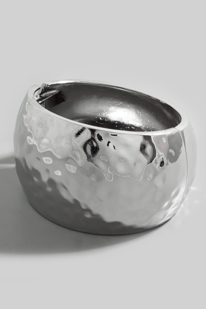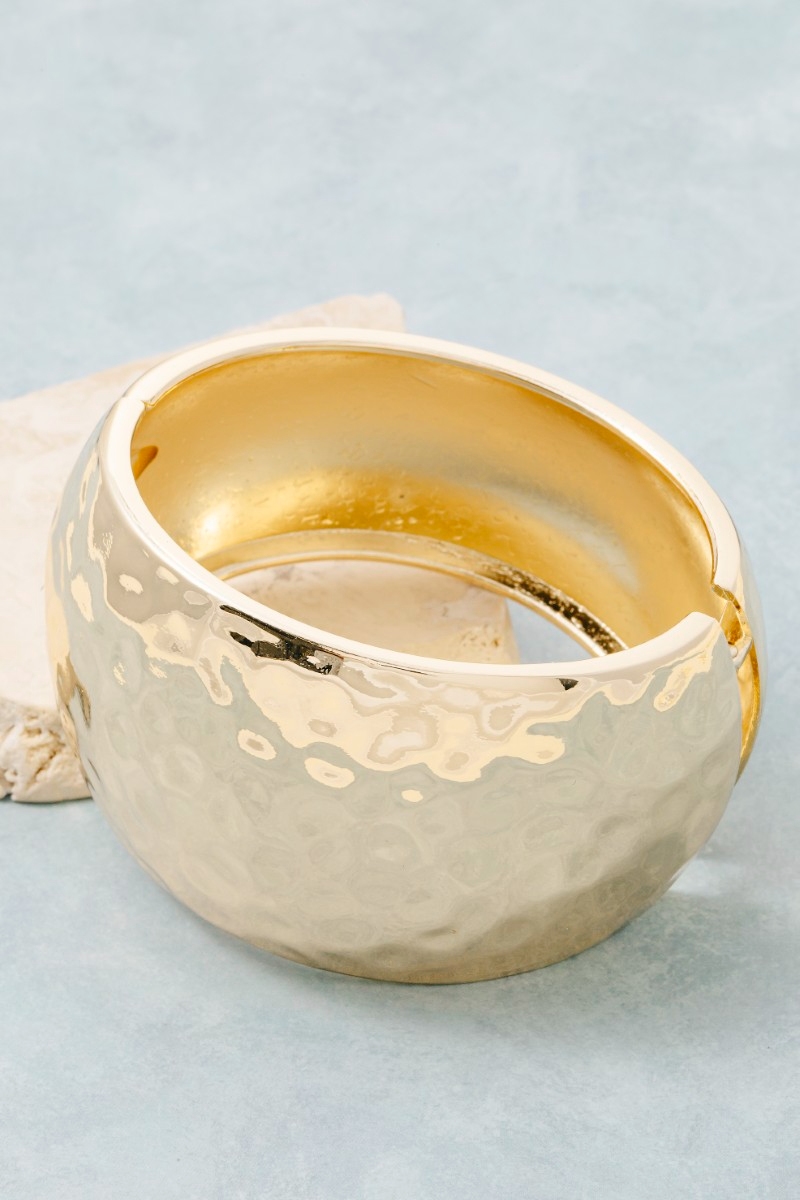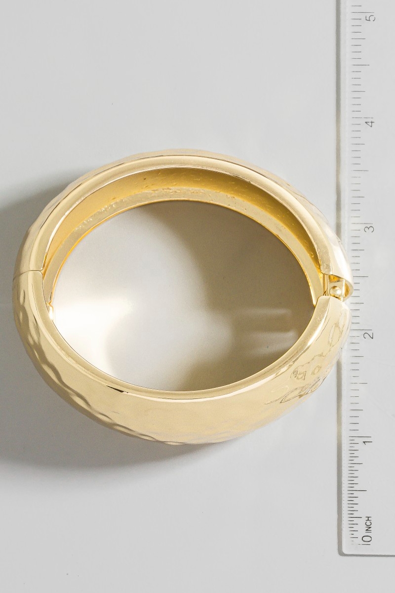 - This bangle bracelet showcases a timeless hammered wide hinge style. Unveil modern elegance with this subtly intricate bangle bracelet.