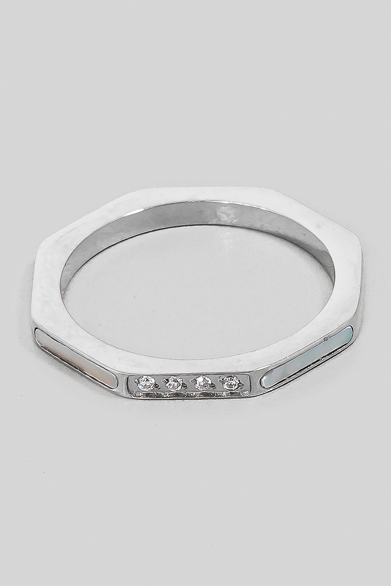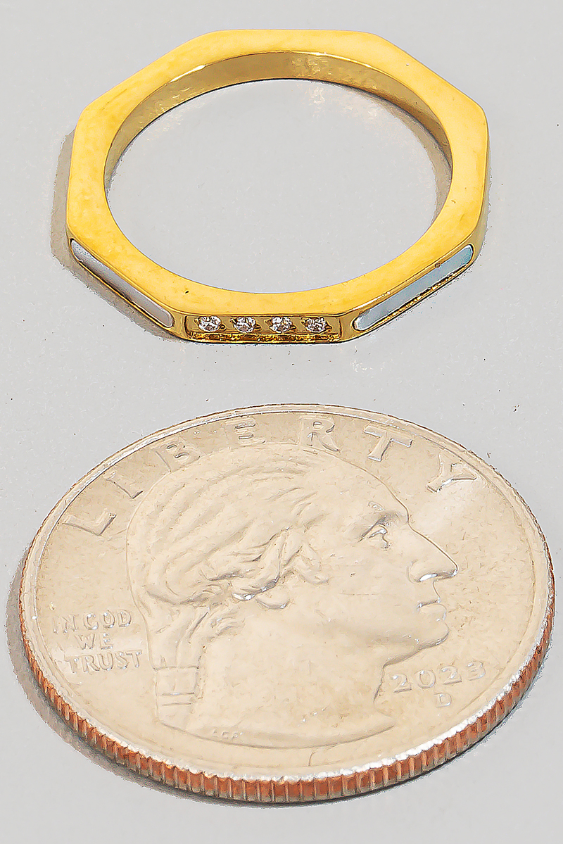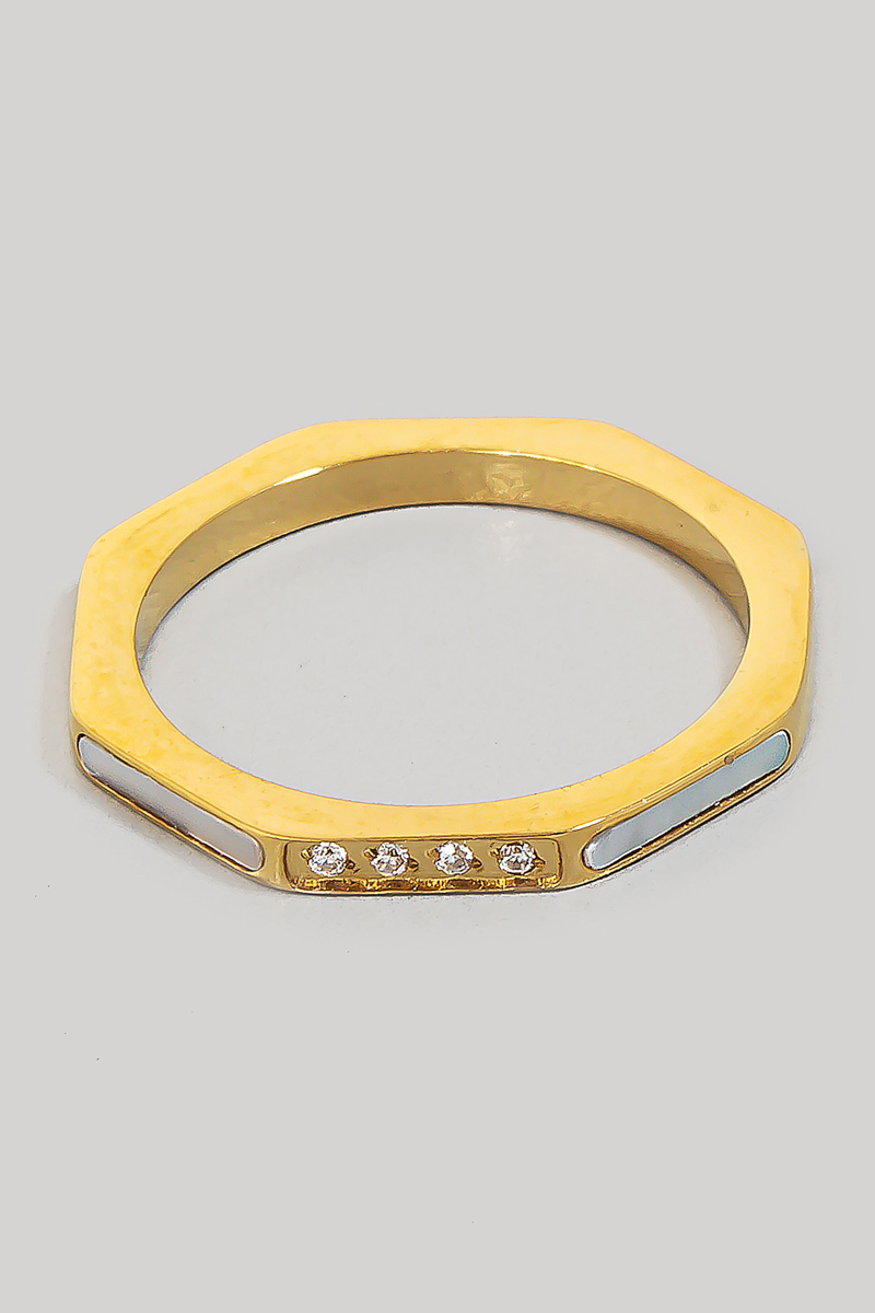 • This ring showcases a unique seashell bar and rhinestone geometric band style. Immerse yourself in fashion finesse with this statement ring.