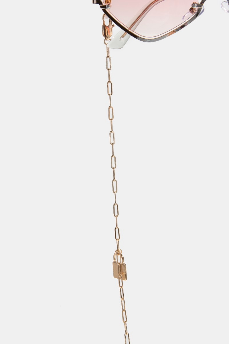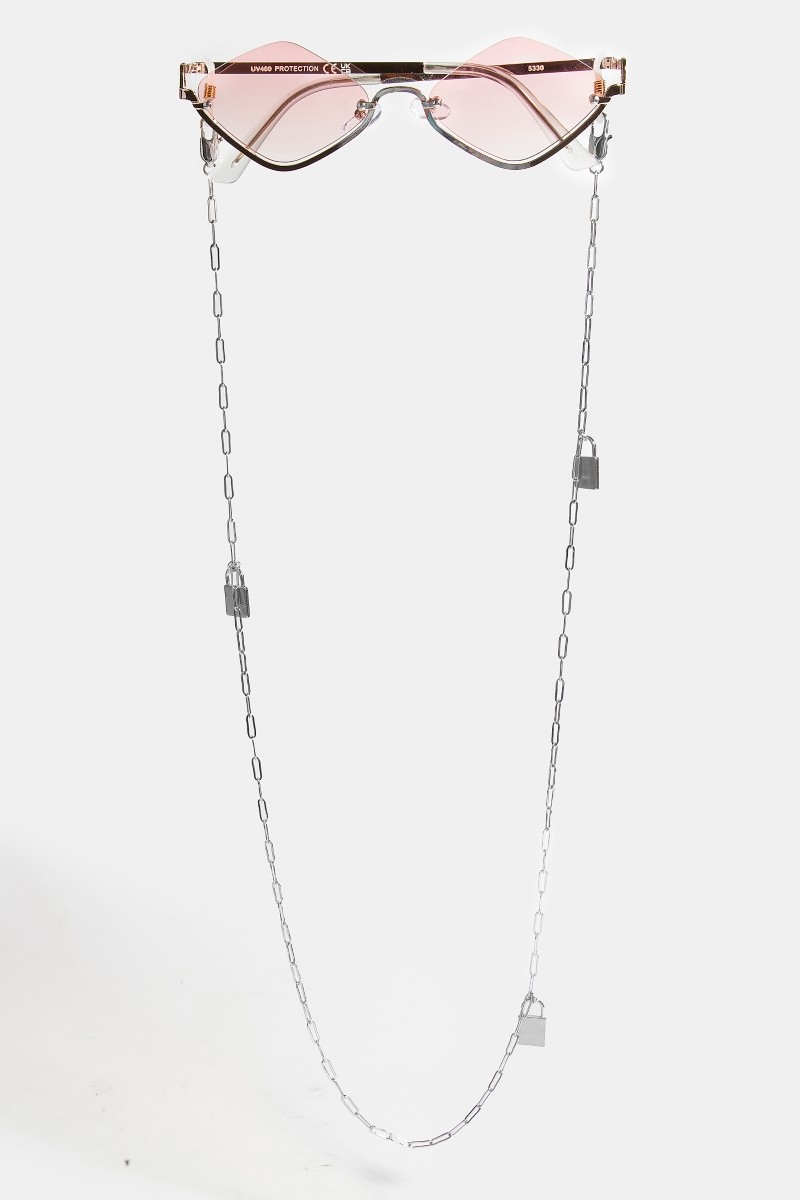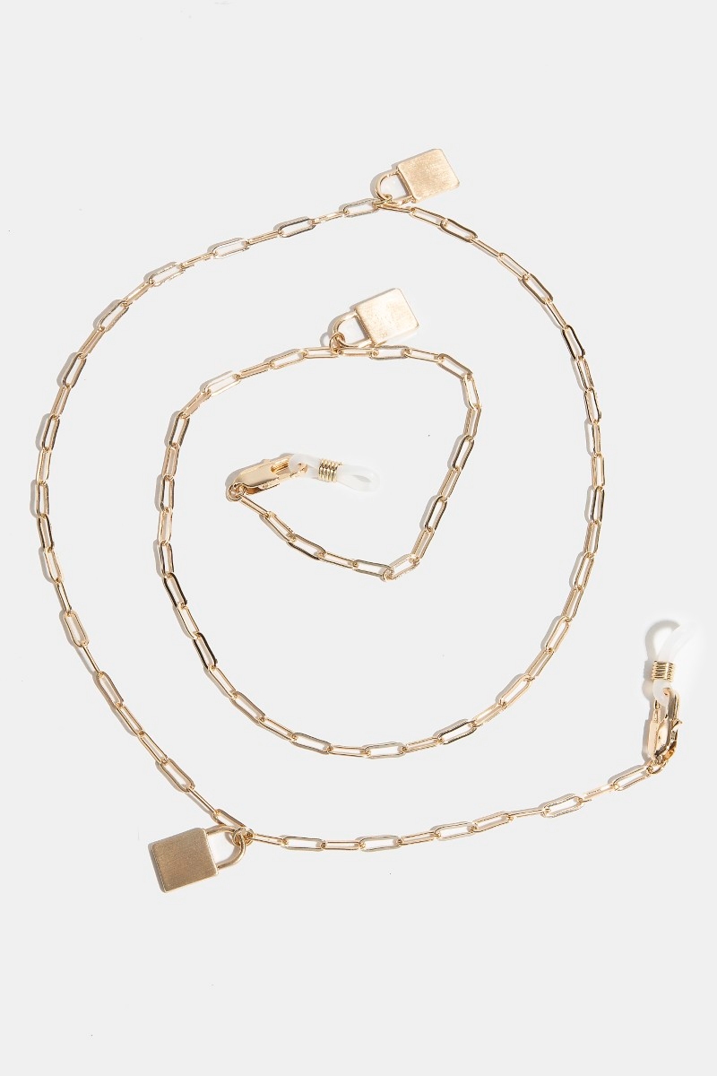 - This accessory features a fashionable lock charm glasses chain style. Unveil a new dimension of sophistication as this accessory effortlessly enhances the elegance of your ensemble.