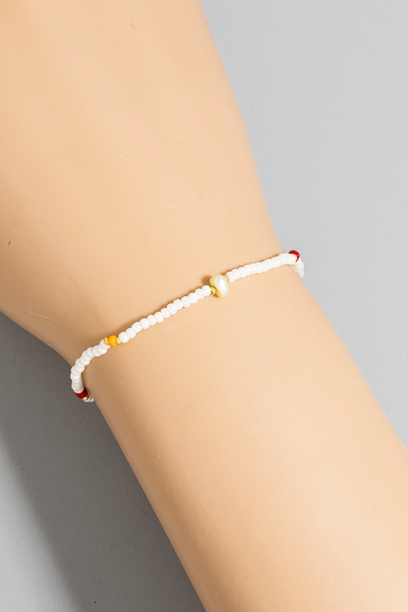 • This bracelet brings a luxurious dainty glass beaded pearl style. Unveil a new dimension of sophistication as this bracelet effortlessly enhances the elegance of your ensemble.