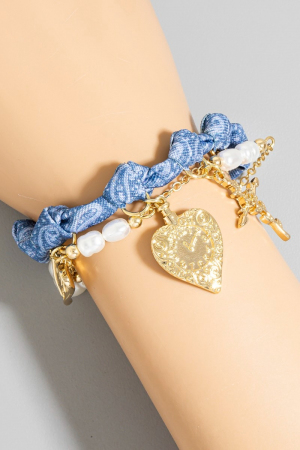• This bracelet displays a fashionable cross floral hearts and pearl charms denim knotted style. Celebrate individual style with this versatile, eye-catching addition.
