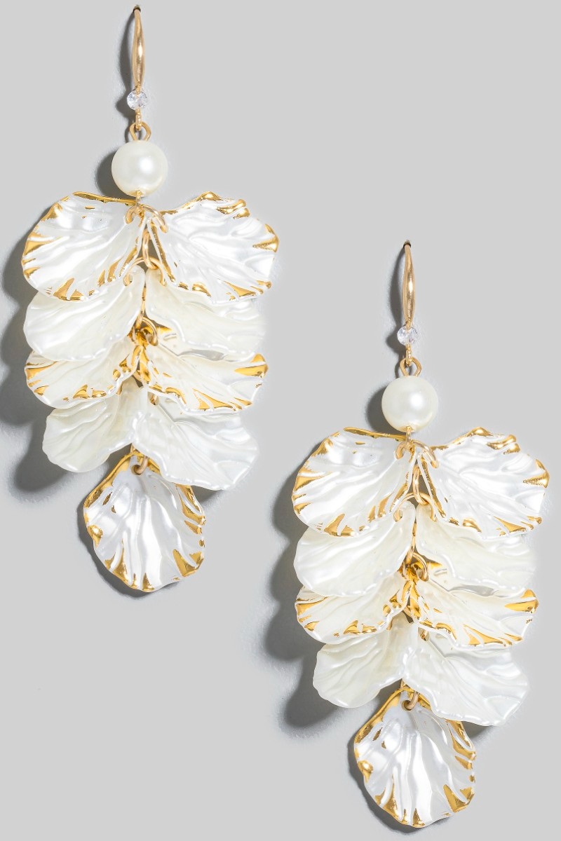 • This pair of dangle earrings introduces a stunning acrylic pearl petals style. Immerse yourself in the world of understated glamour as this pair of dangle earrings effortlessly exudes timeless appeal.