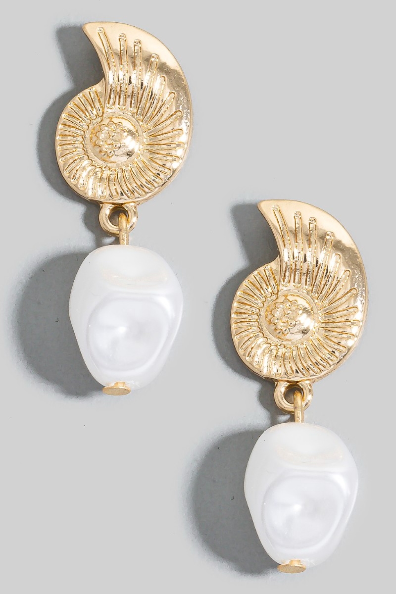 • This pair of dangle earrings introduces a stunning metallic sea shell and pearl bead charm style. Savor the craftsmanship that goes beyond the ordinary, as this pair of dangle earrings effortlessly captivates attention.