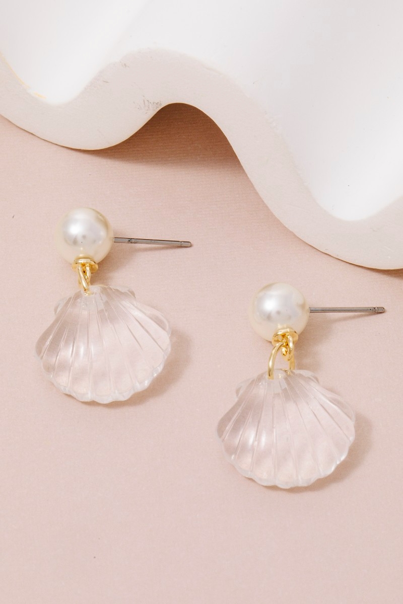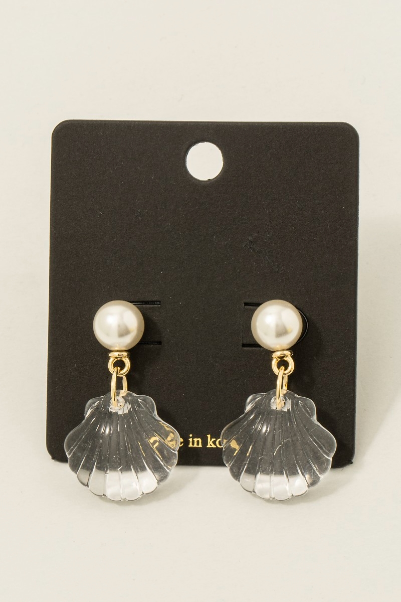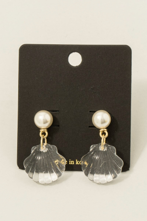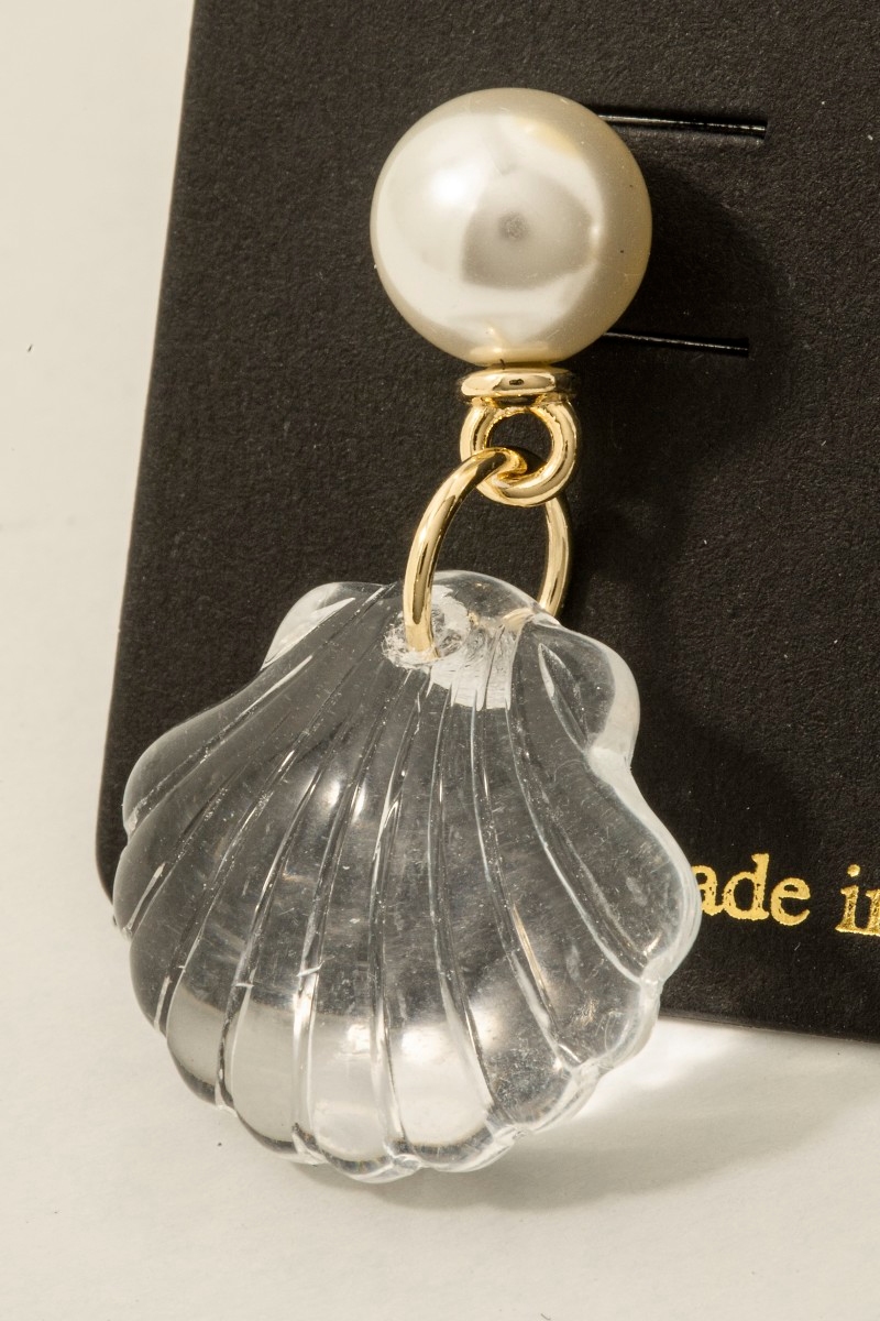 • This pair of dangle earrings displays a vibrant pearl and clear clam shell style. Celebrate individual style with this versatile, eye-catching addition.
