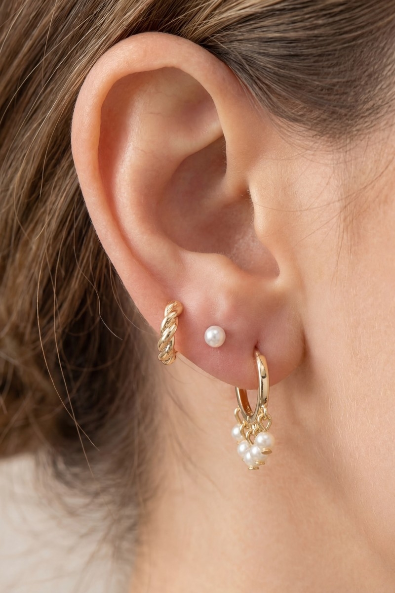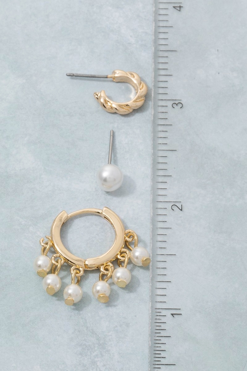 - This pair of earrings introduces a unique three pair assorted pearl set style. Immerse yourself in the world of understated glamour as this pair of earrings effortlessly exudes timeless appeal.