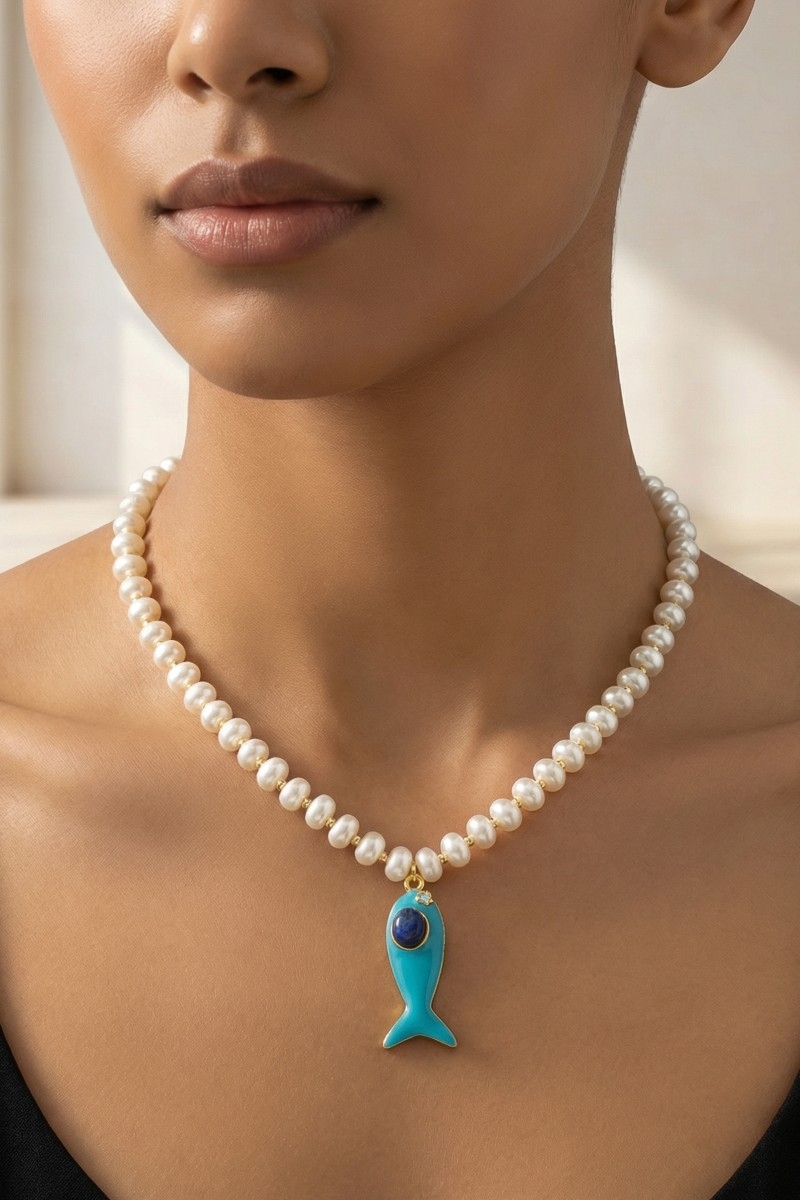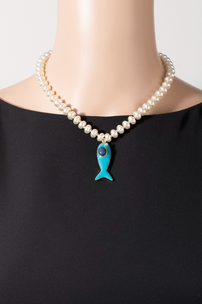 • This pendant necklace brings a unique enamel fish pendant pearl beaded necklace style. Experience a burst of creativity in accessorizing as this piece effortlessly sets the tone for your unique style.