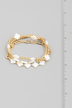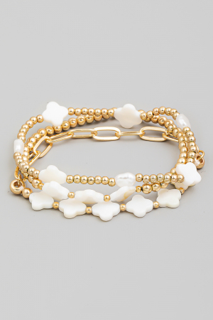 - This bracelet displays a fashionable mother of pearl clover beads set style. Embark on a journey of sartorial refinement as this accessory effortlessly complements your fashion sense.