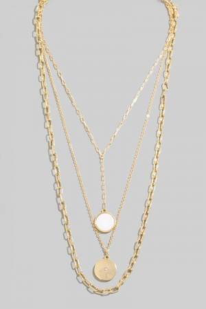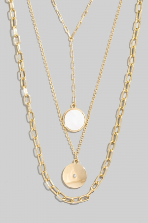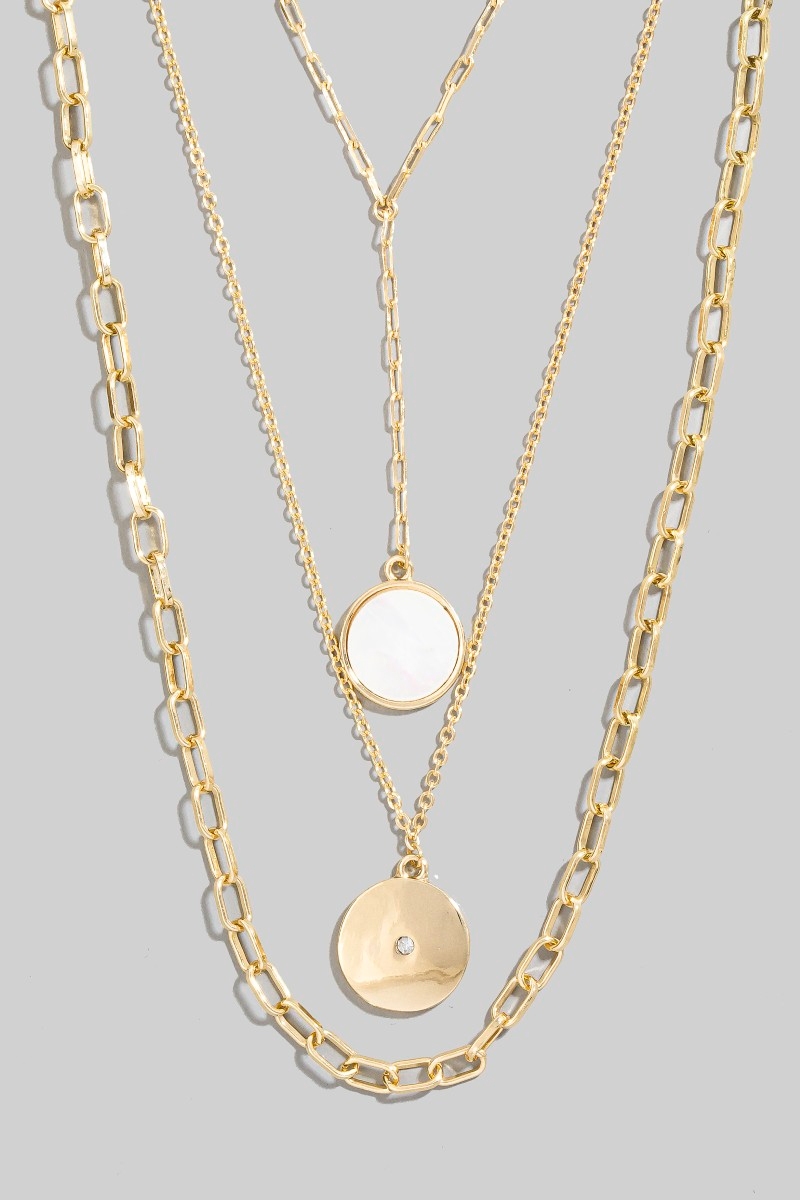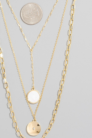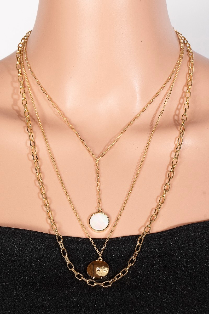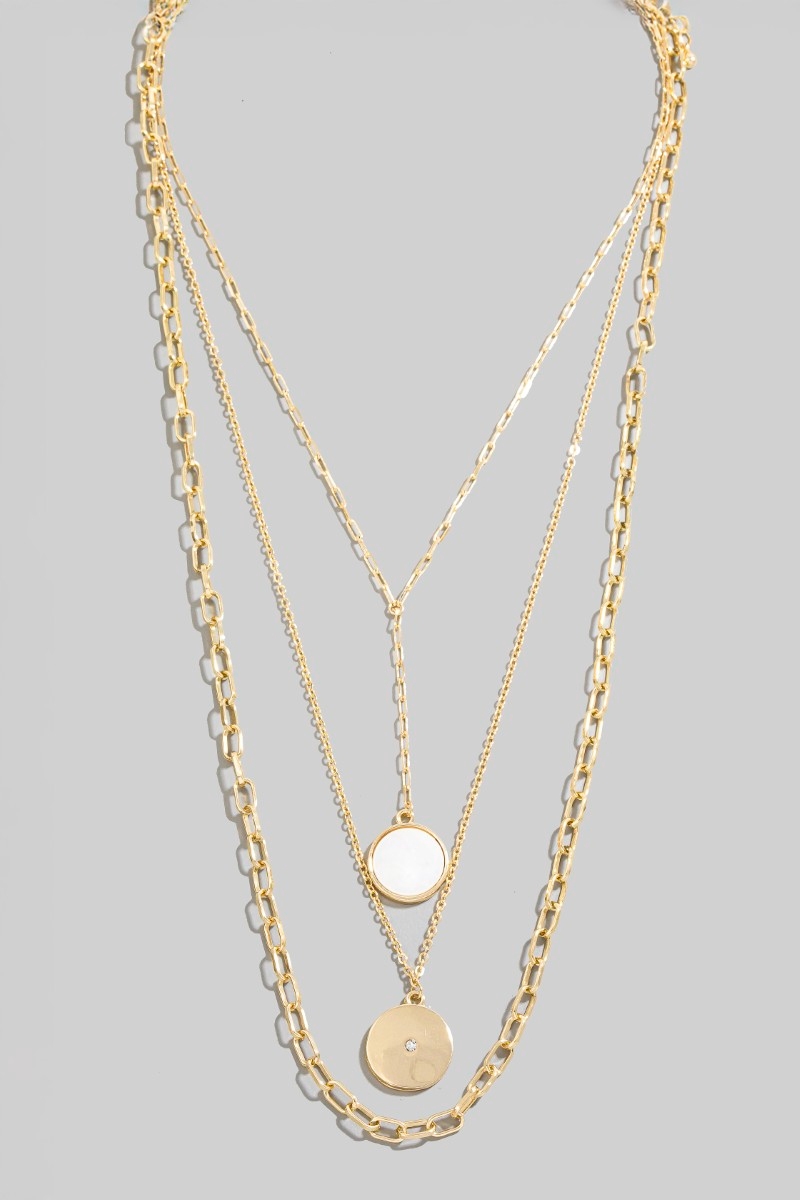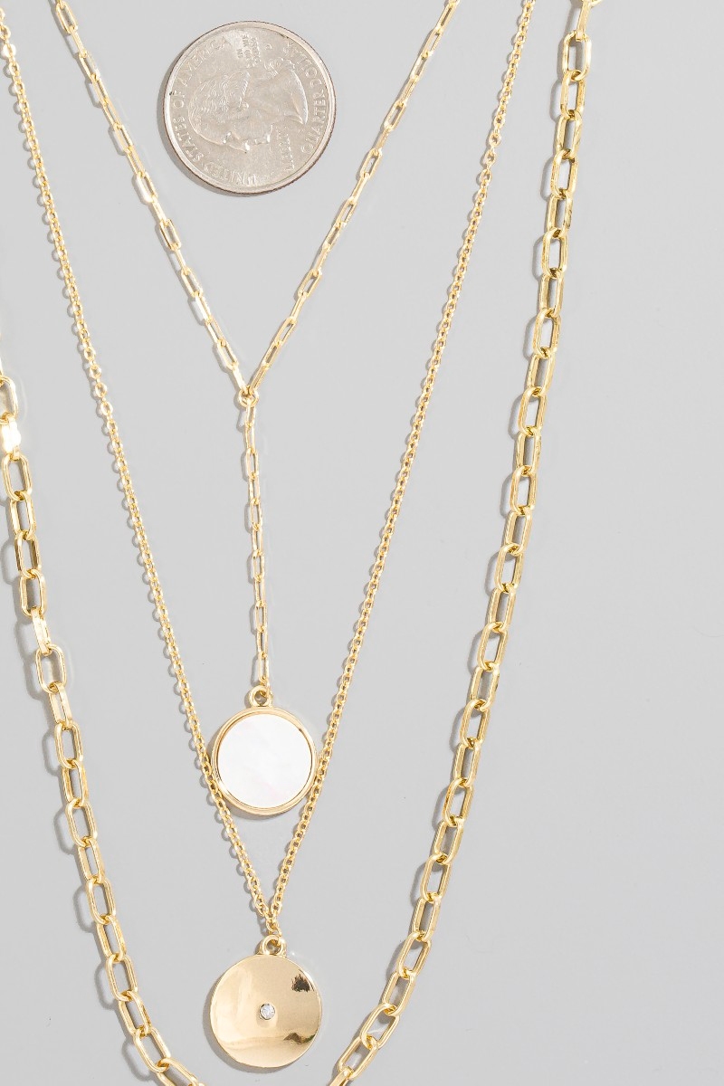 - This chain necklace introduces a unique mother of pearl and cubic zirconia coin pendants layered style. Discover the perfect balance of subtlety and flair as this chain necklace effortlessly completes your look.