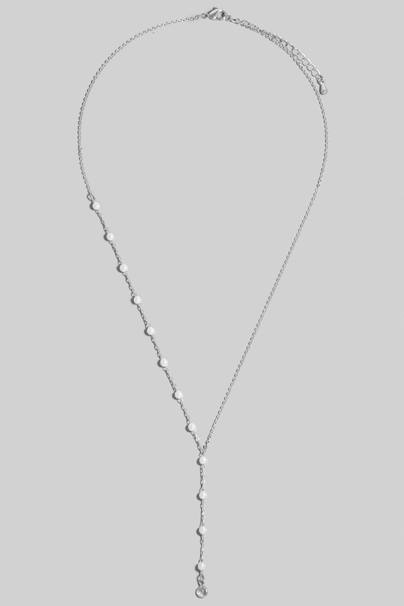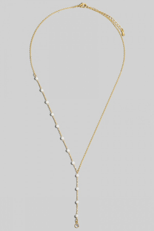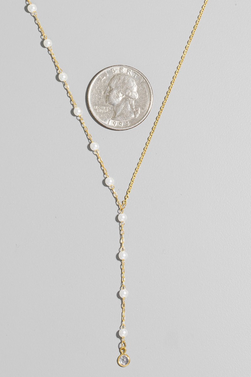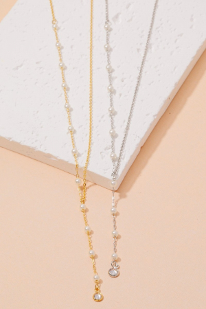 • This necklace displays a vibrant dainty chain pearl bead lariat style. Immerse yourself in the details of design, as this necklace effortlessly becomes a conversation starter.