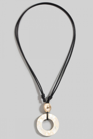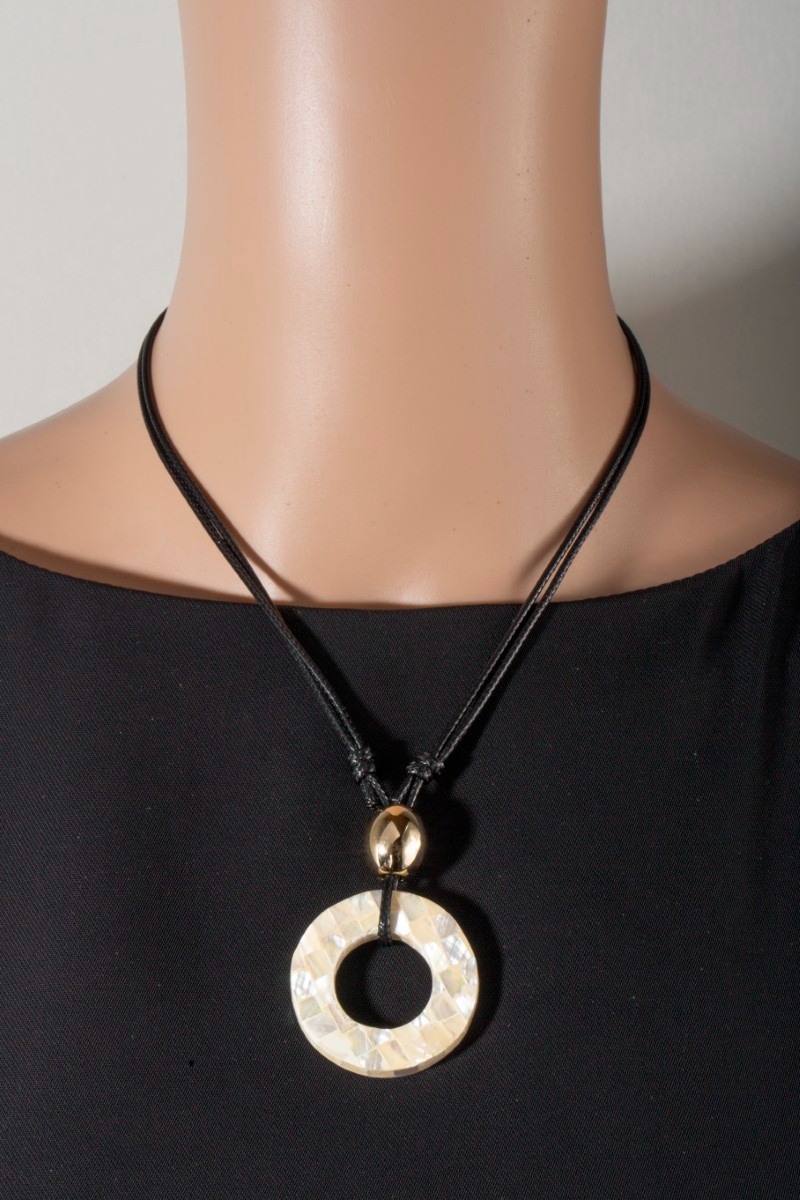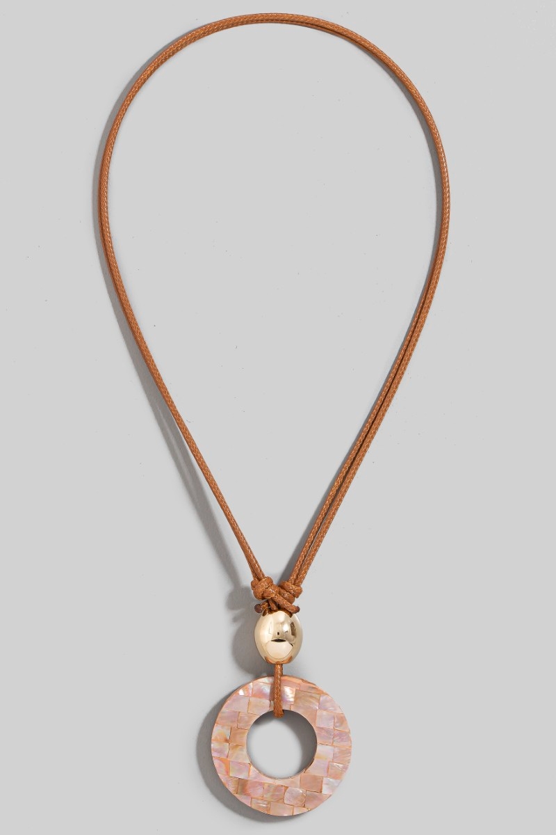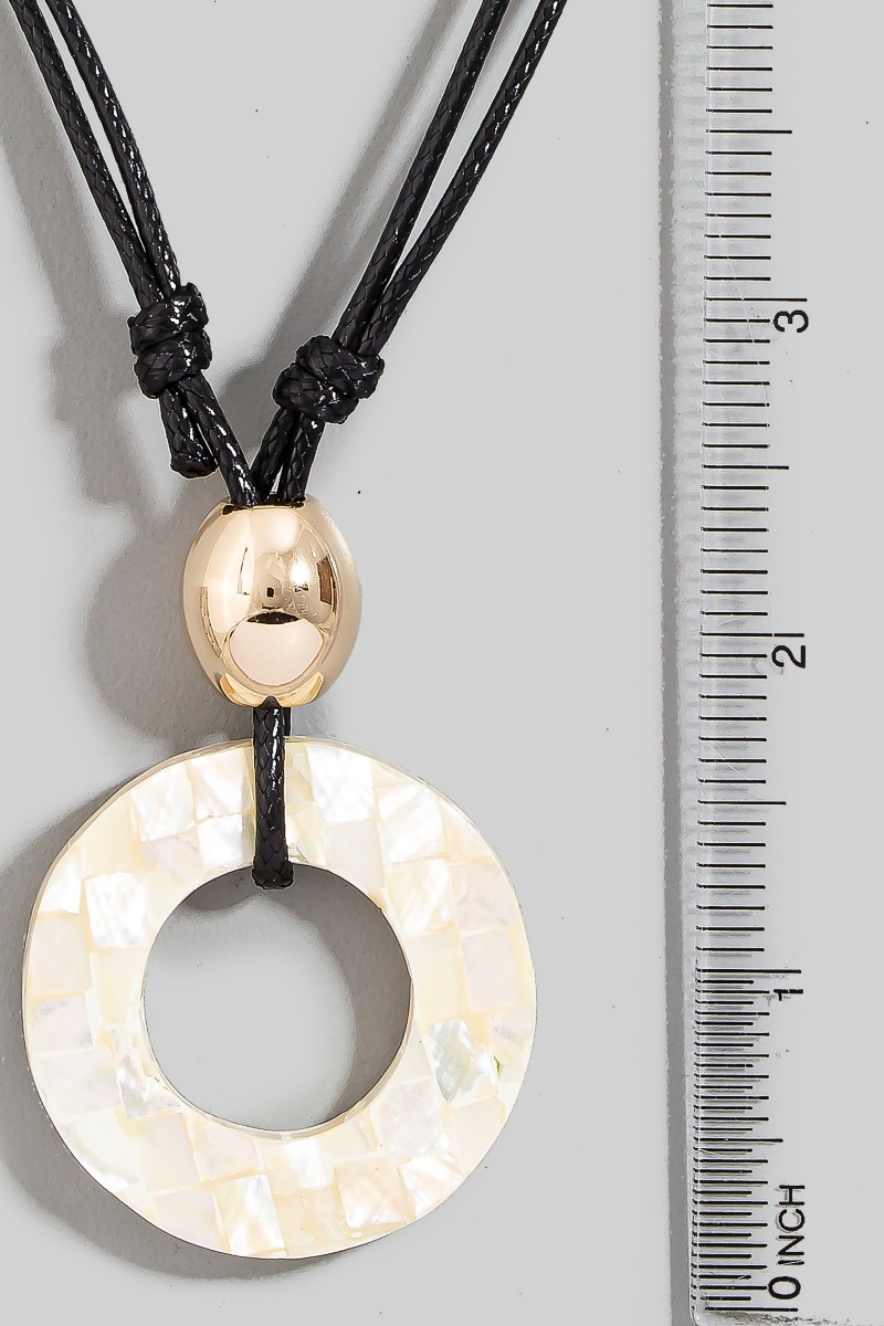 - This pendant necklace introduces a stunning mother of pearl mosaic hoop pendant and bead layered cord necklace style. Savor the craftsmanship that goes beyond the ordinary, as this pendant necklace effortlessly captivates attention.