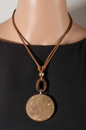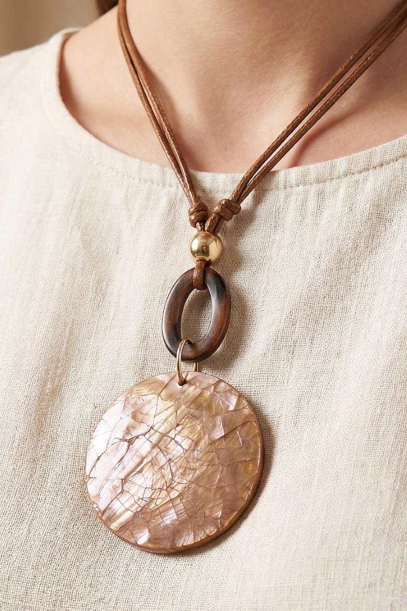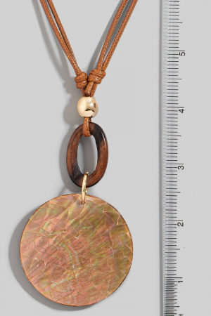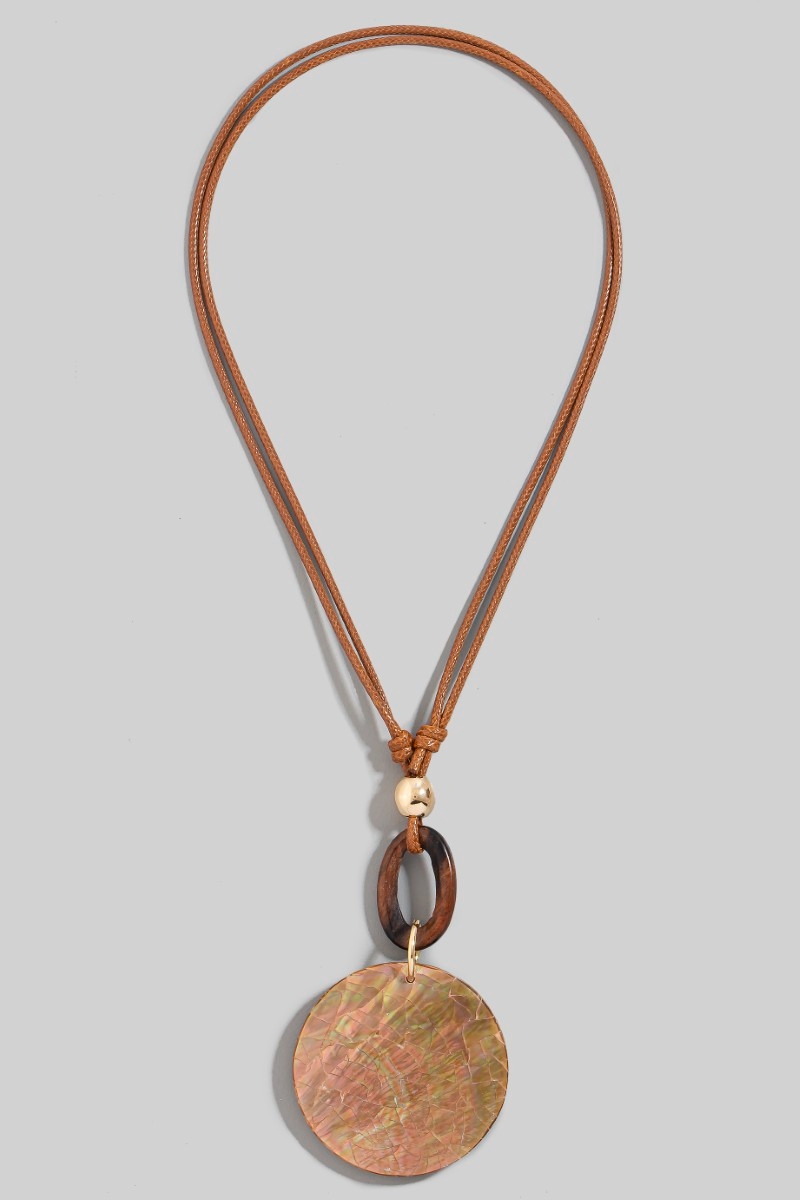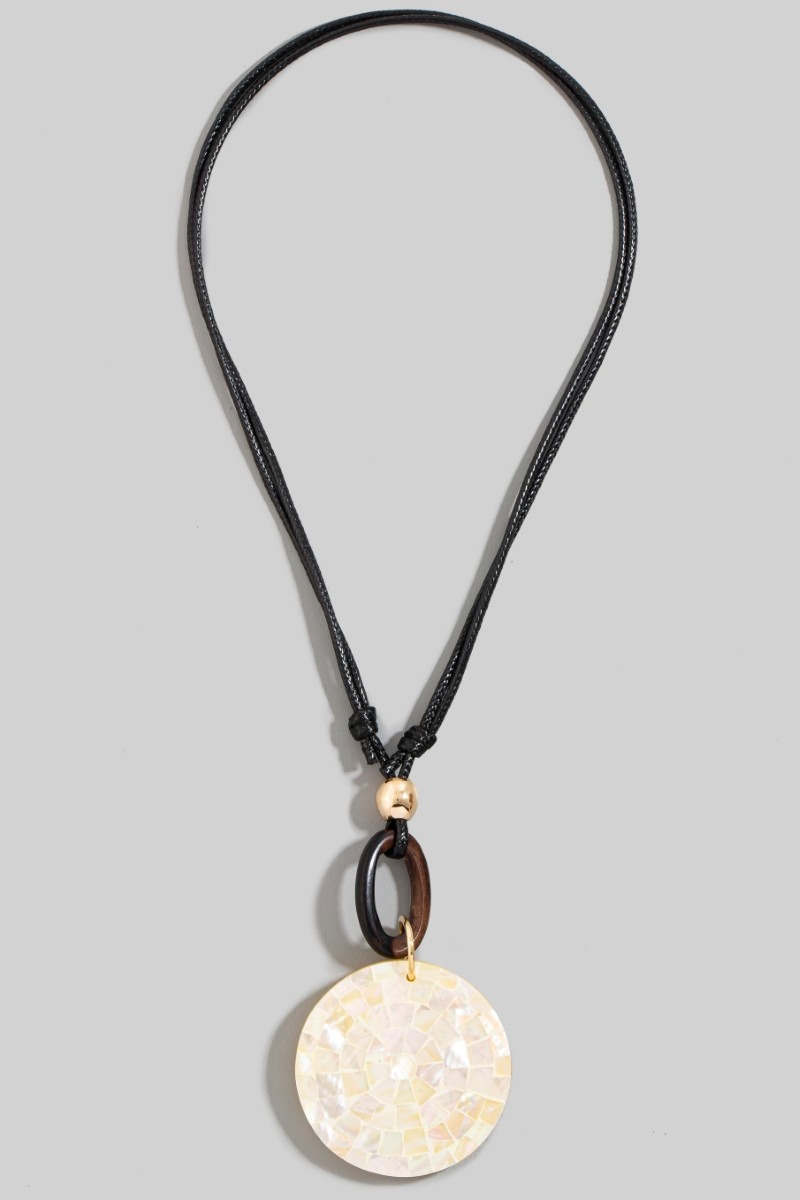 • This pendant necklace showcases a timeless mosaic shell disc and wooden hoop pendant cord necklace style. Experience refined sophistication with this understated yet stylish piece.