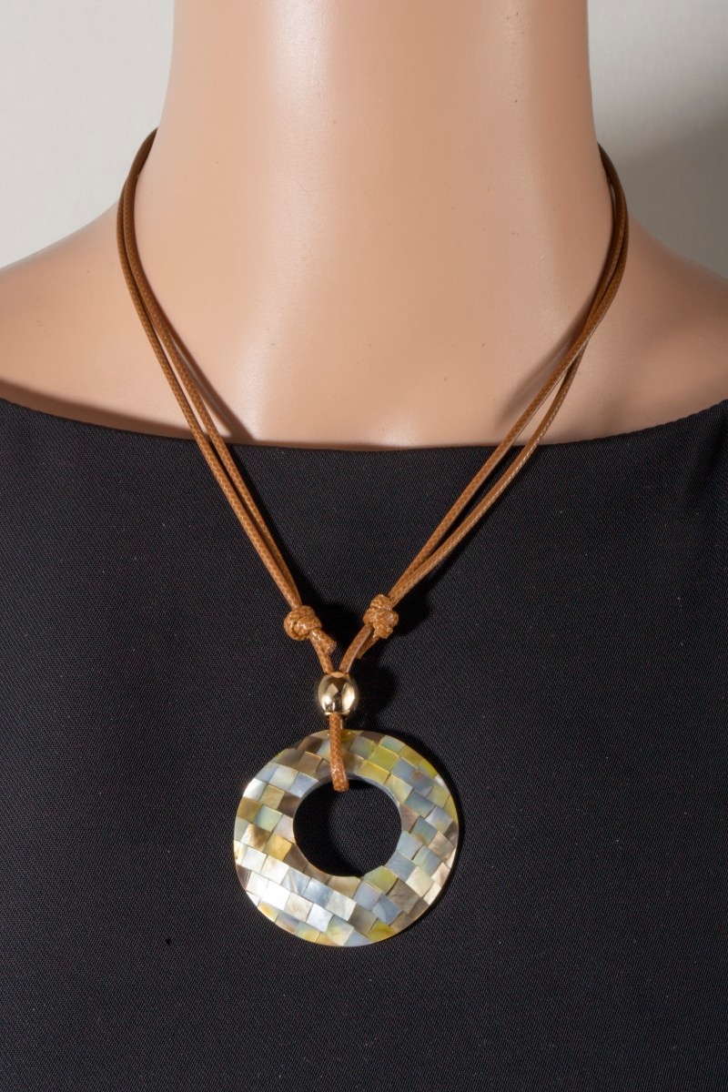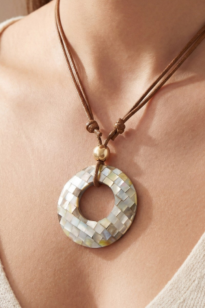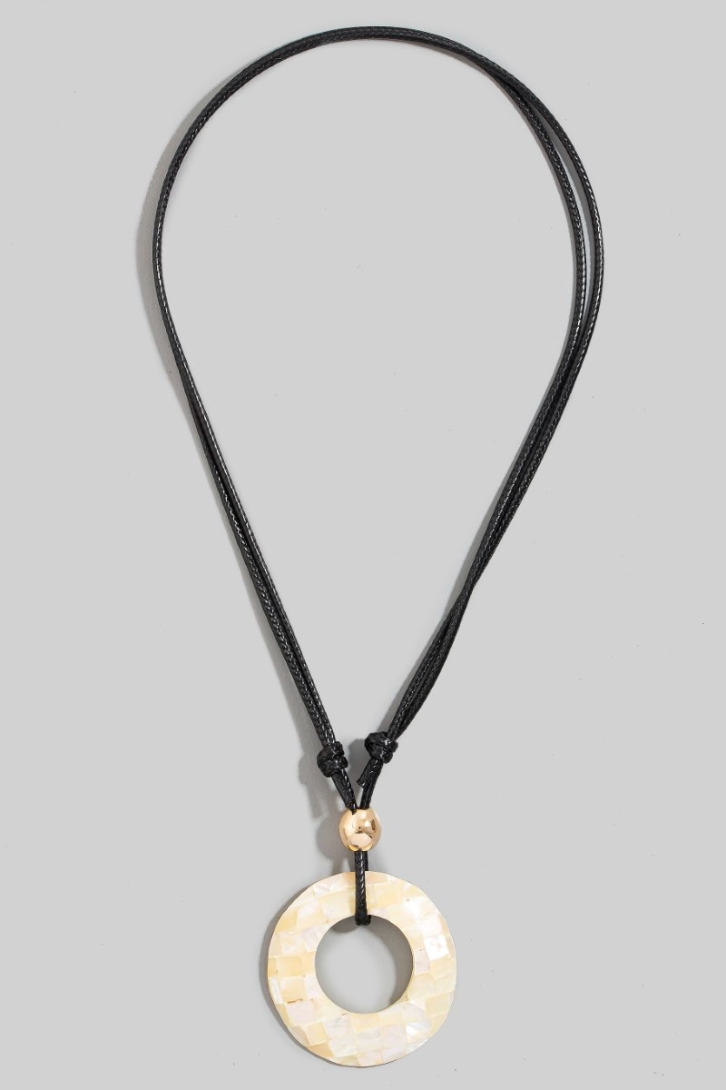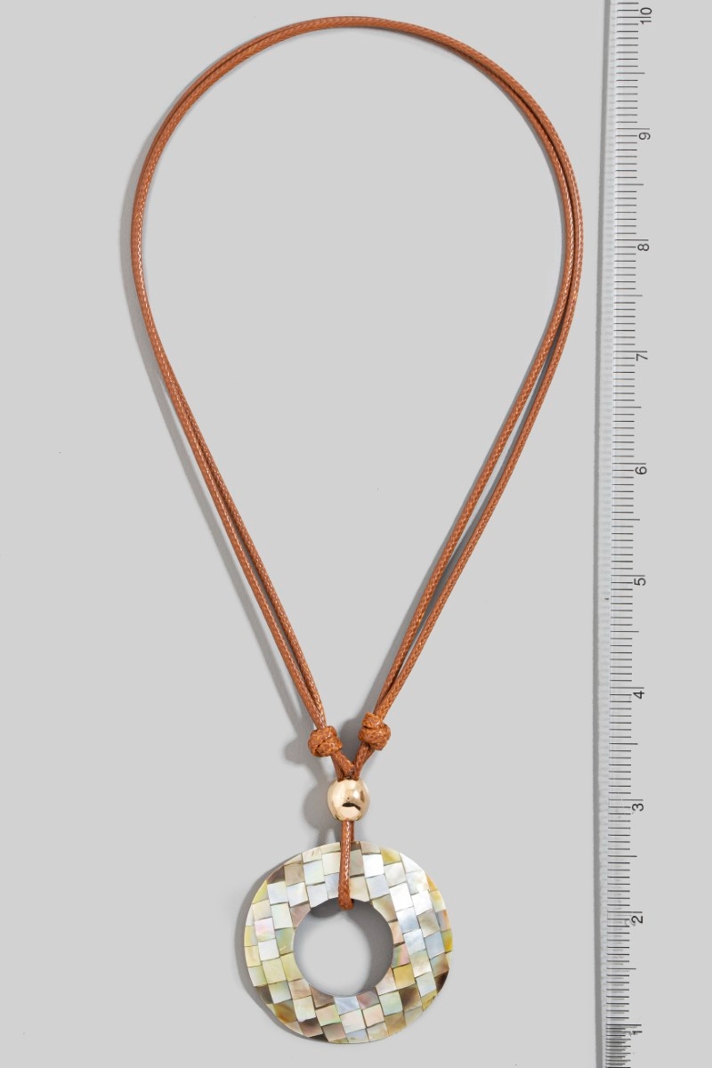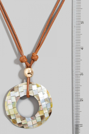 • This pendant necklace displays a vibrant mother of pearl mosaic hoop pendant layered cord necklace style. Indulge in the allure of exquisite craftsmanship as this pendant necklace effortlessly adds a touch of luxury to your attire.