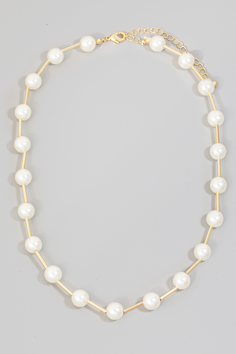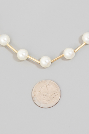 • This chain necklace features a fashionable pearl bead station style. Experience a burst of creativity in accessorizing as this piece effortlessly sets the tone for your unique style.