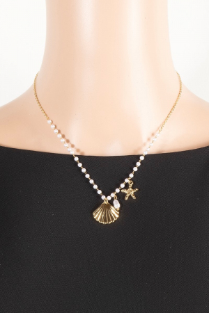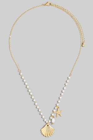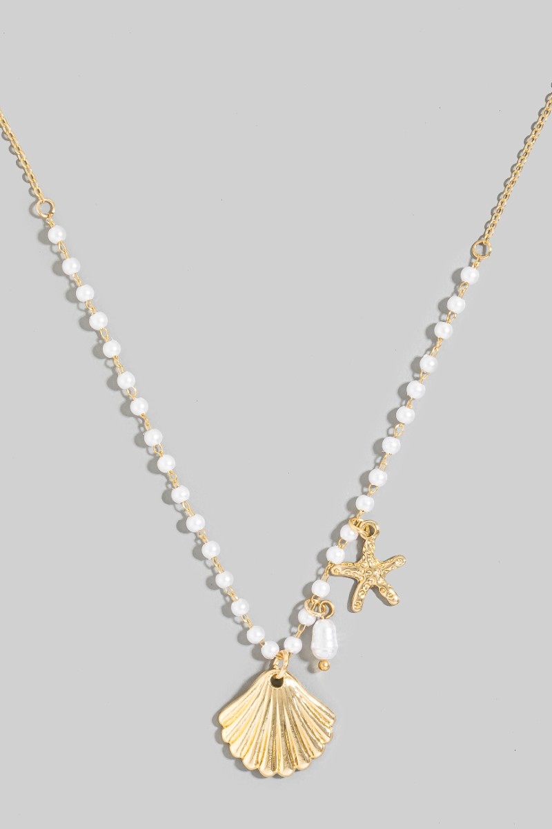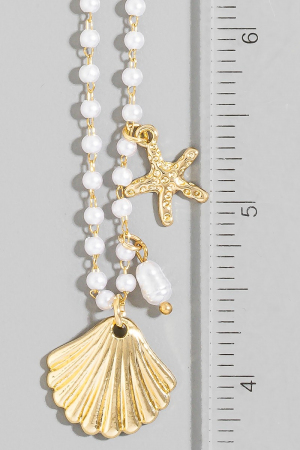 - This necklace introduces a stunning starfish and clam shell charms pearl beaded style. Savor the allure of detailed craftsmanship in this exquisite necklace.