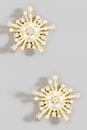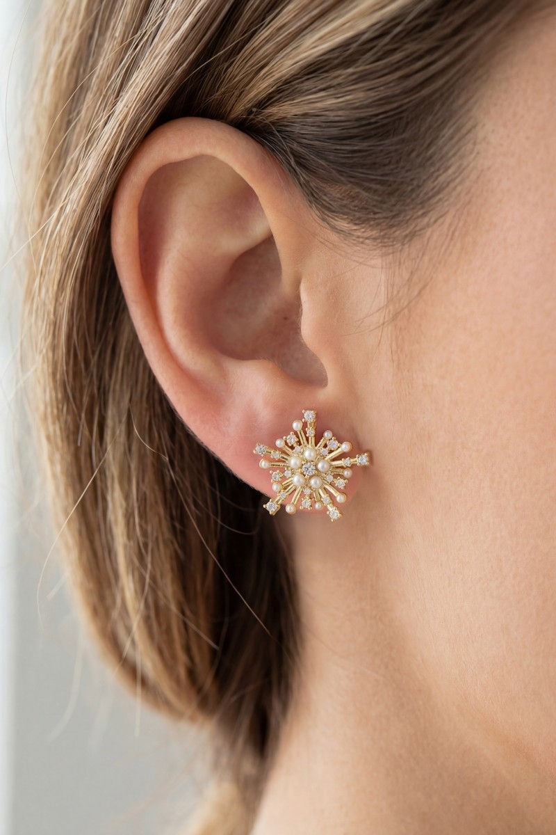 - This pair of stud earrings displays a fashionable pearl and cubic zirconia studded sunburst style. Witness the perfect fusion of style and functionality as this pair of stud earrings effortlessly complements your lifestyle.