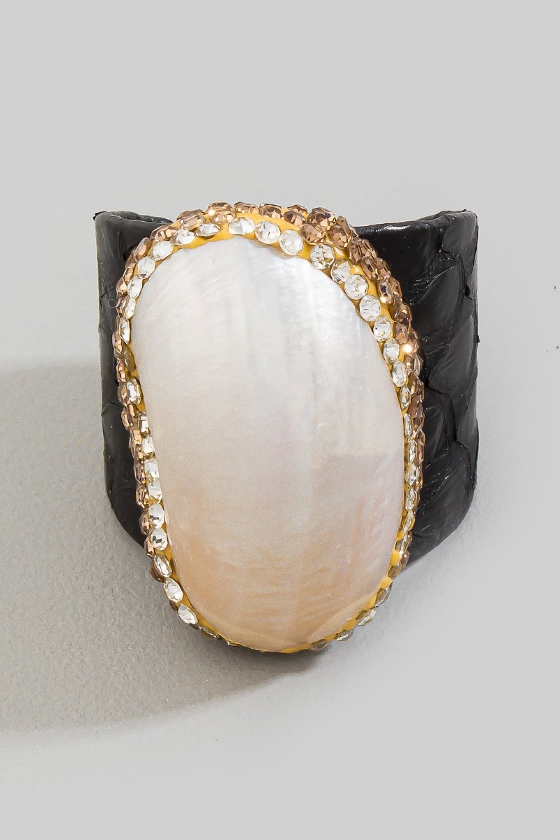 Pave Mother Of Pearl With Leather Band Statement Ring