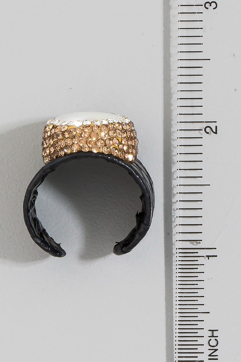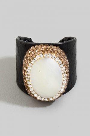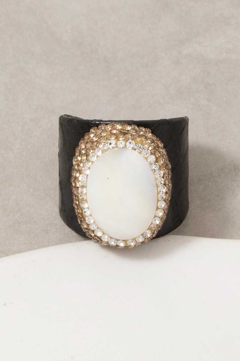 - This ring brings a unique pave mother of pearl with leather band statement style. Elevate your ensemble with this chic, timeless ring.