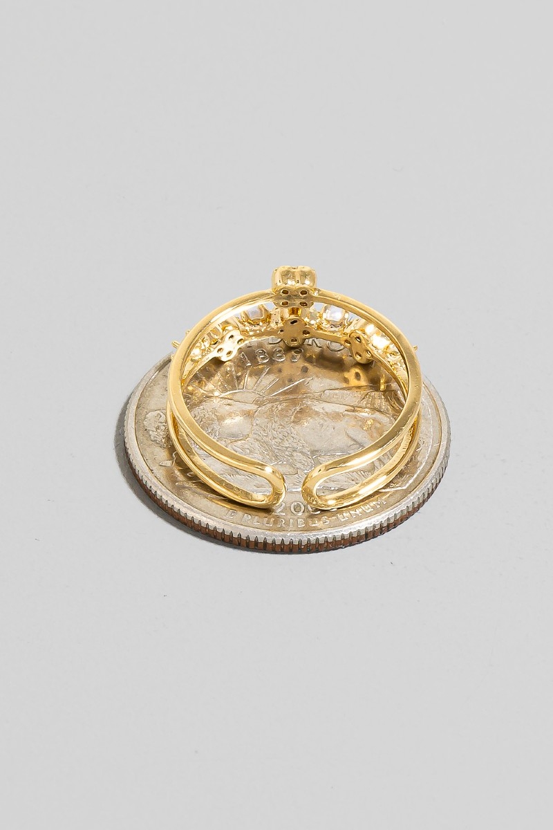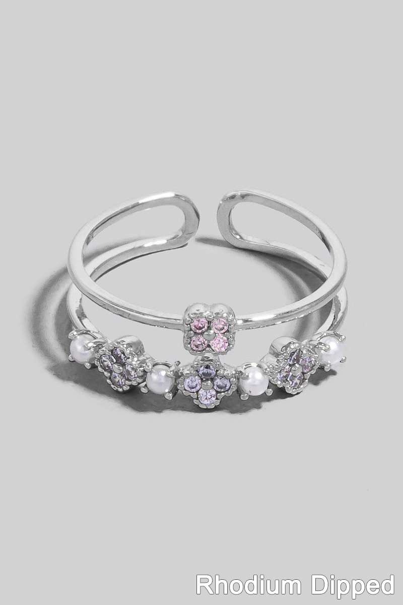 - This ring displays a fashionable pearl cubic zirconia clovers layered open band style. Unveil a new dimension of sophistication as this ring effortlessly enhances the elegance of your ensemble.
