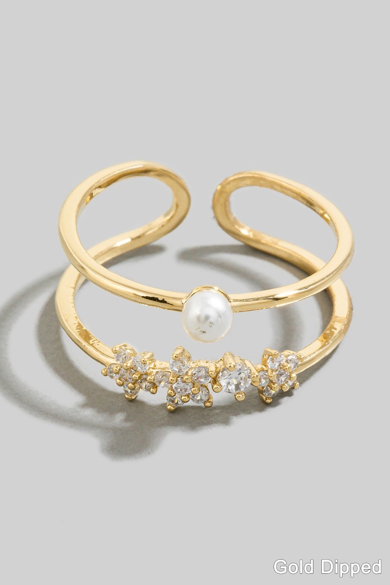 • This ring displays a fashionable two row gold dipped cubic zirconia flower pearl style. Revel in the intricate design that effortlessly distinguishes this ring, making it a statement piece.