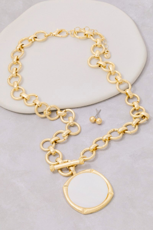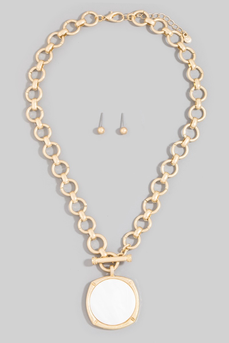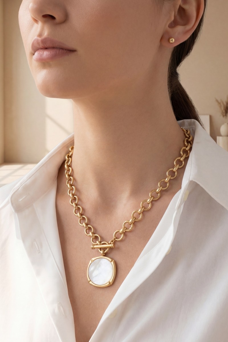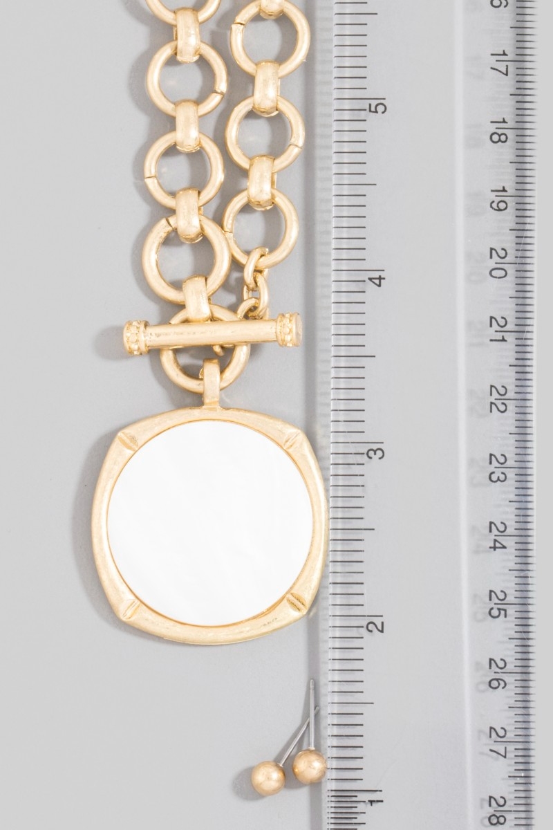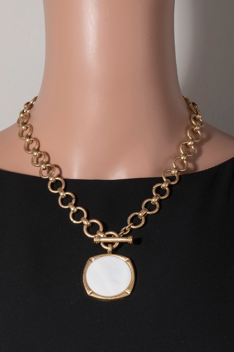 • This necklace showcases a timeless rounded mother of pearl disc pendant set style. Savor the craftsmanship that goes beyond the ordinary, as this necklace effortlessly captivates attention.