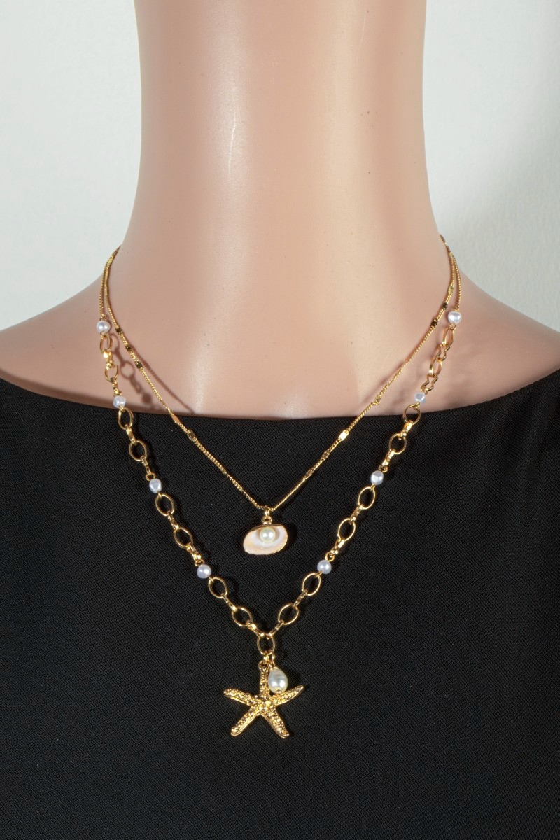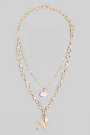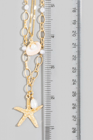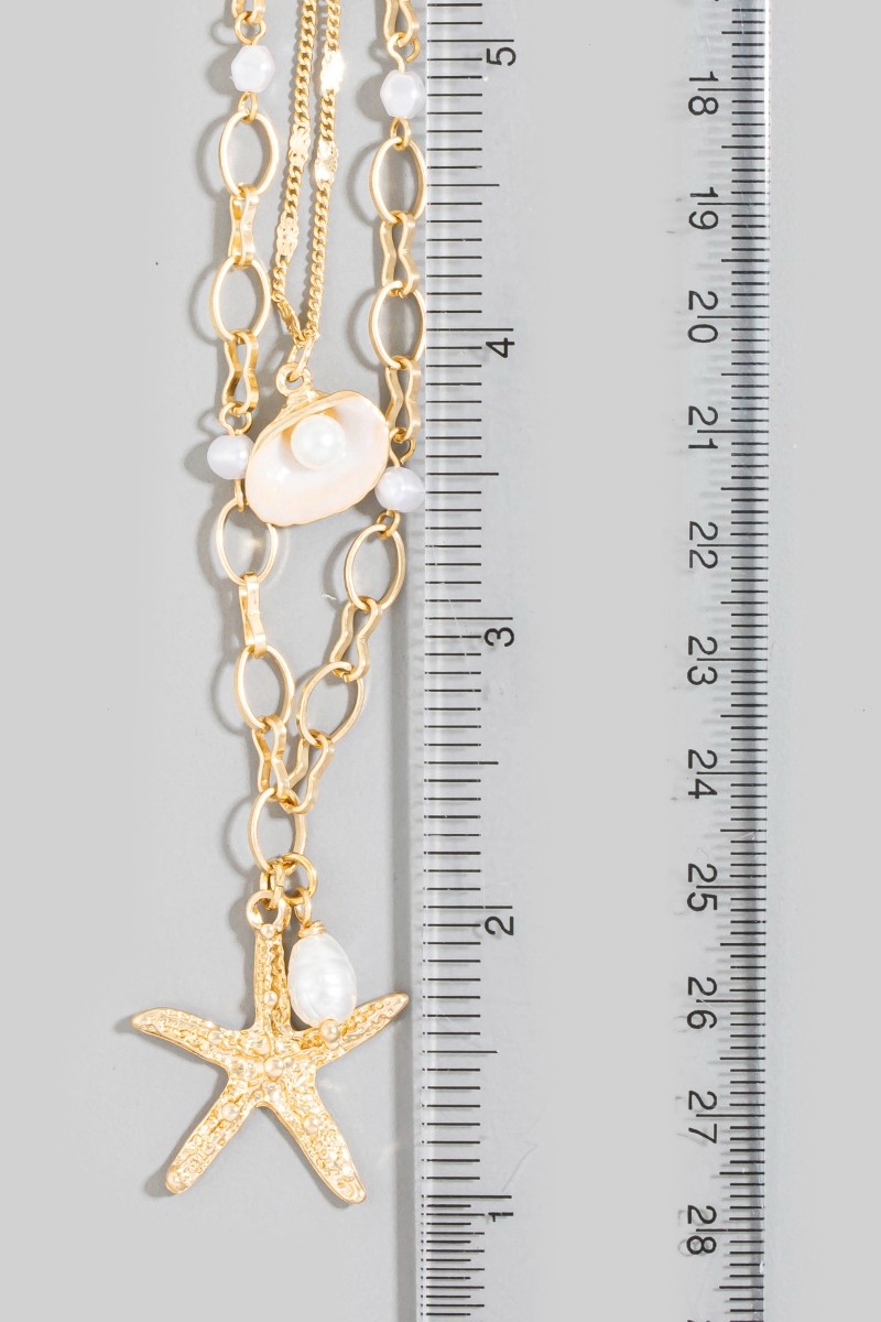 • This chain necklace features a fashionable starfish and pearl clam shell pendants layered style. Embark on a journey of sartorial refinement as this chain necklace effortlessly complements your fashion sense.