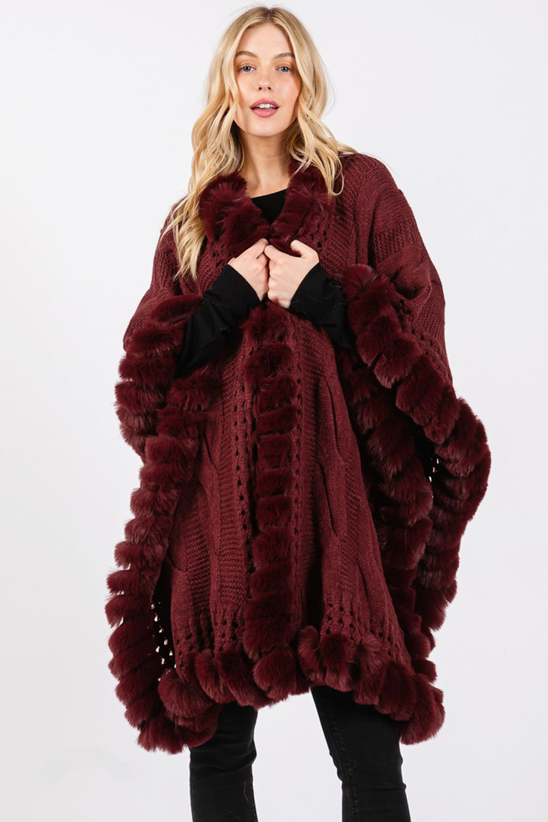 - This poncho displays a vibrant faux fur trim cape style. Witness the perfect fusion of style and functionality as this poncho effortlessly complements your lifestyle.