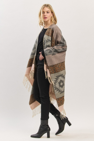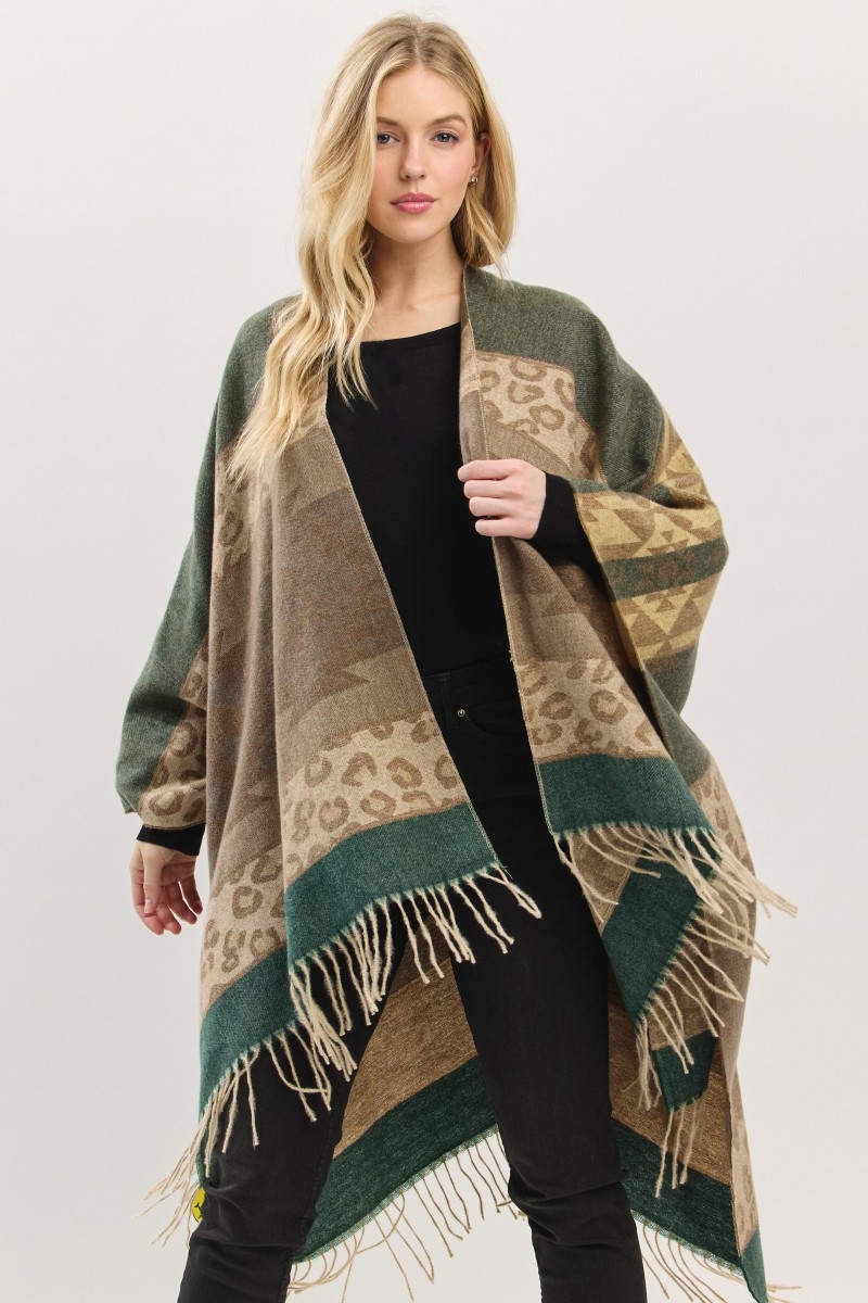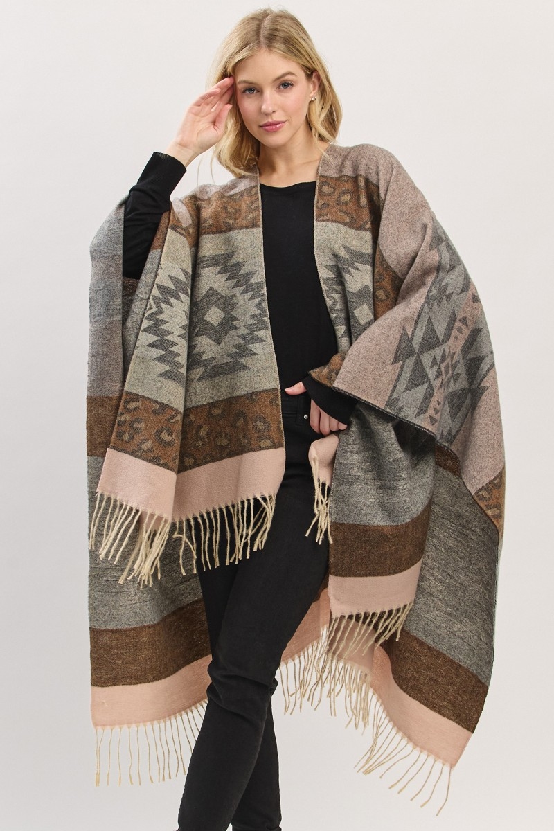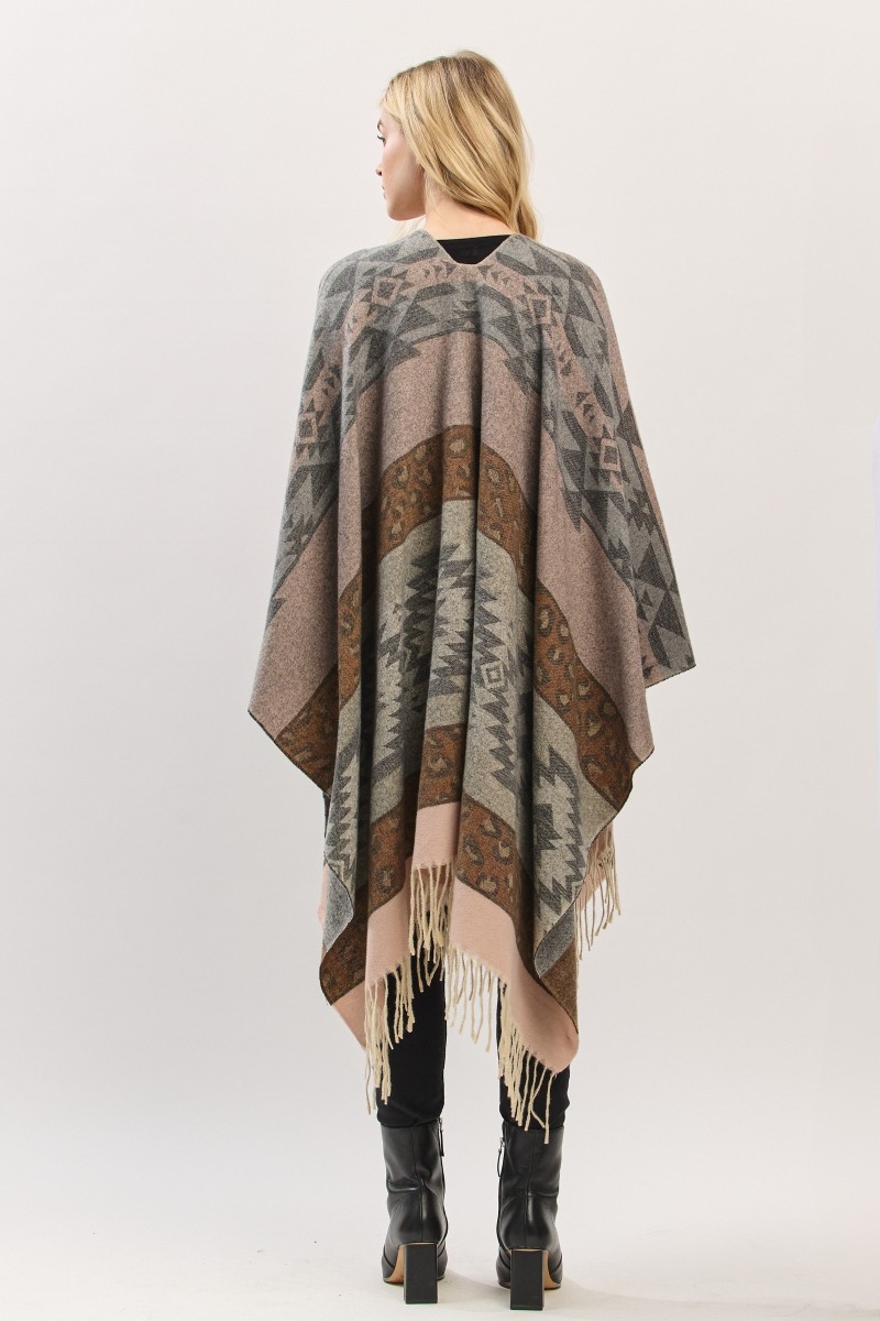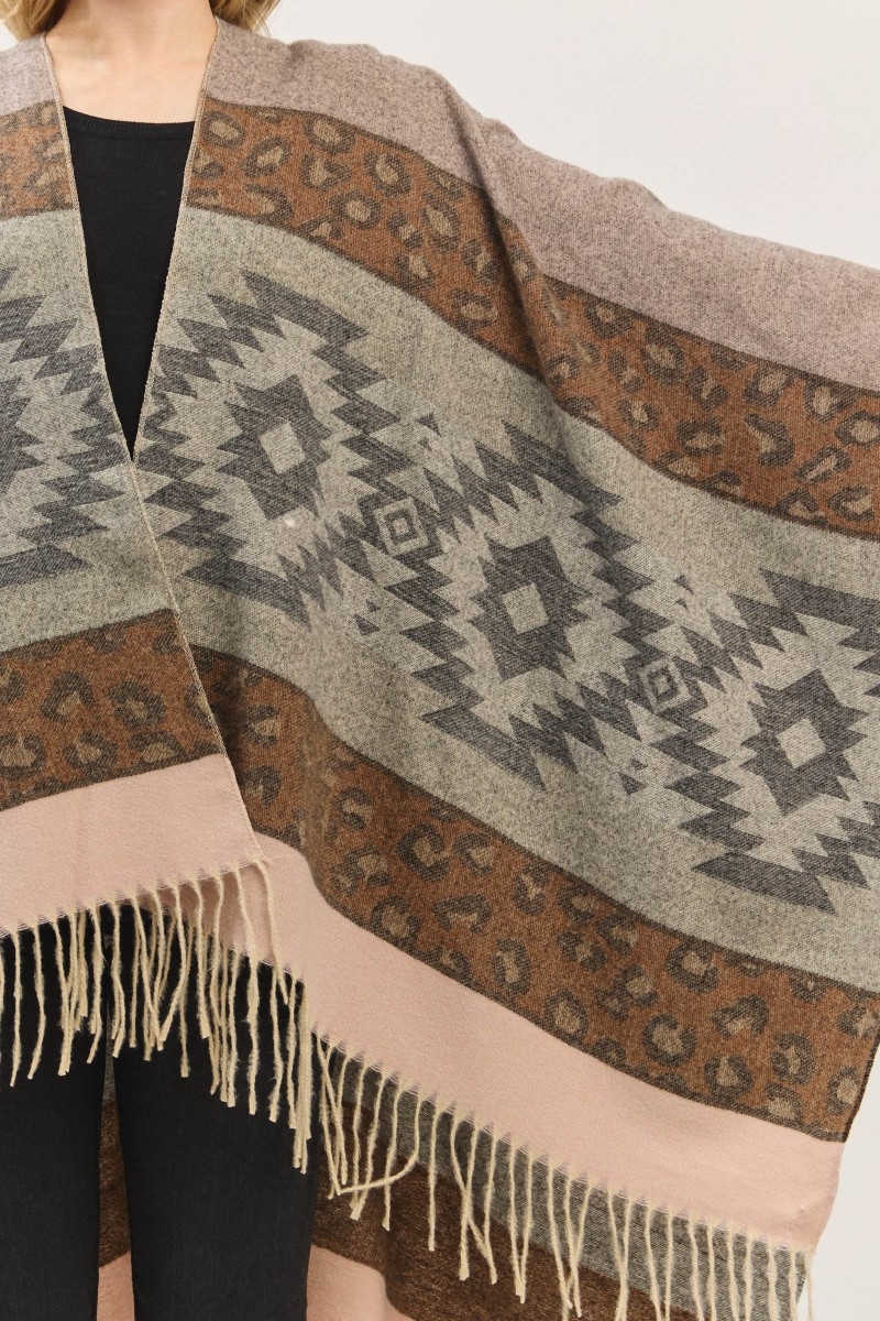 - This poncho displays a vibrant striped aztec leopard pattern fringe ruana style. Immerse yourself in fashion finesse with this statement poncho.