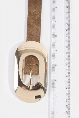 - This leather belt showcases a timeless long oval buckle vegan style. Unveil a new dimension of sophistication as this leather belt effortlessly enhances the elegance of your ensemble.