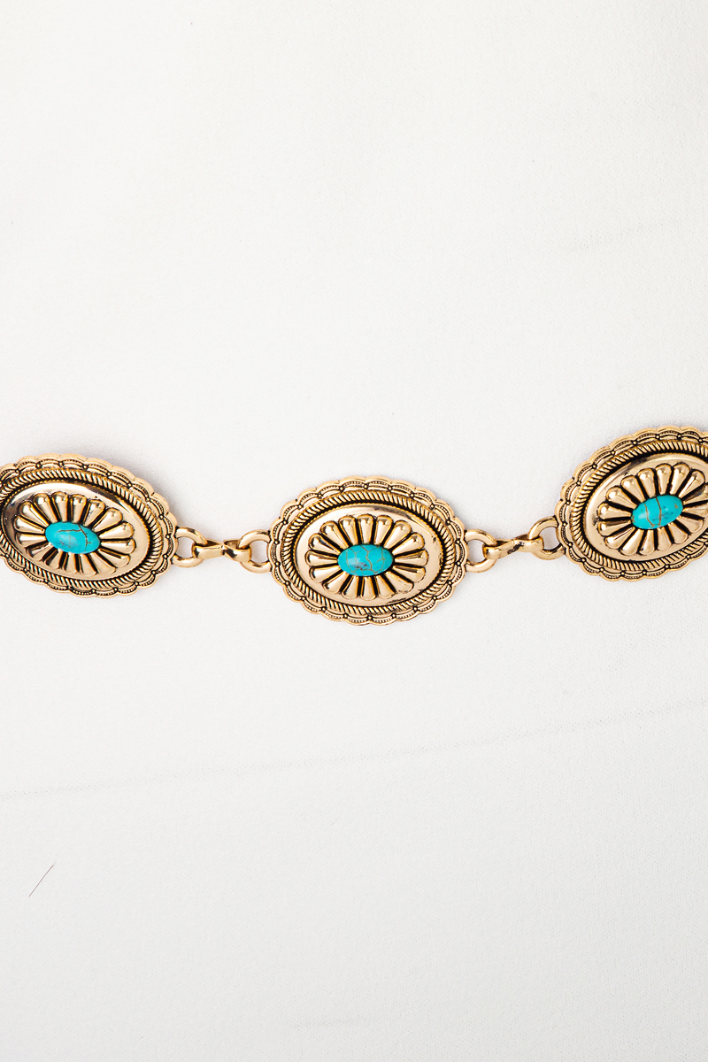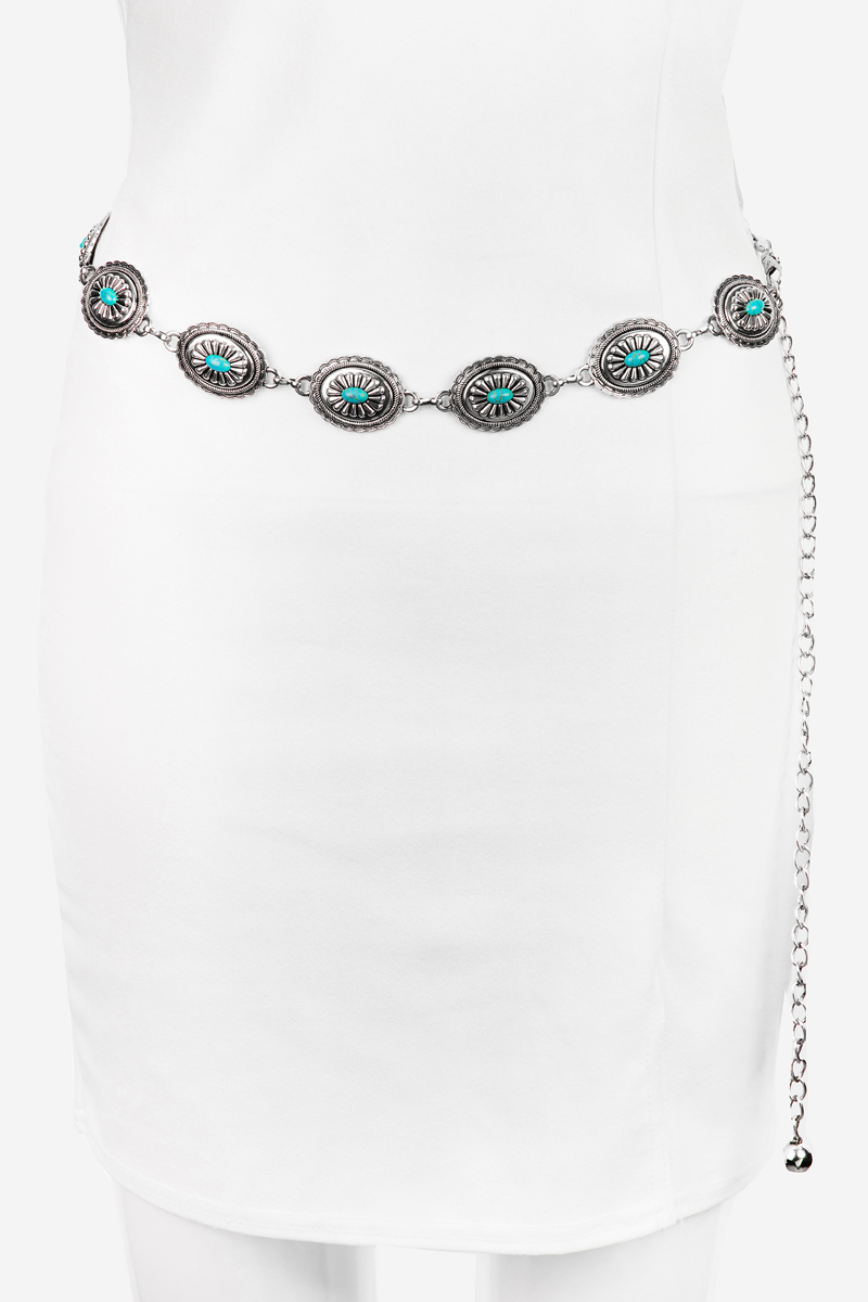 - This chain belt displays a fashionable oval concho turquoise disc concho style. Savor the craftsmanship that goes beyond the ordinary, as this chain belt effortlessly captivates attention.