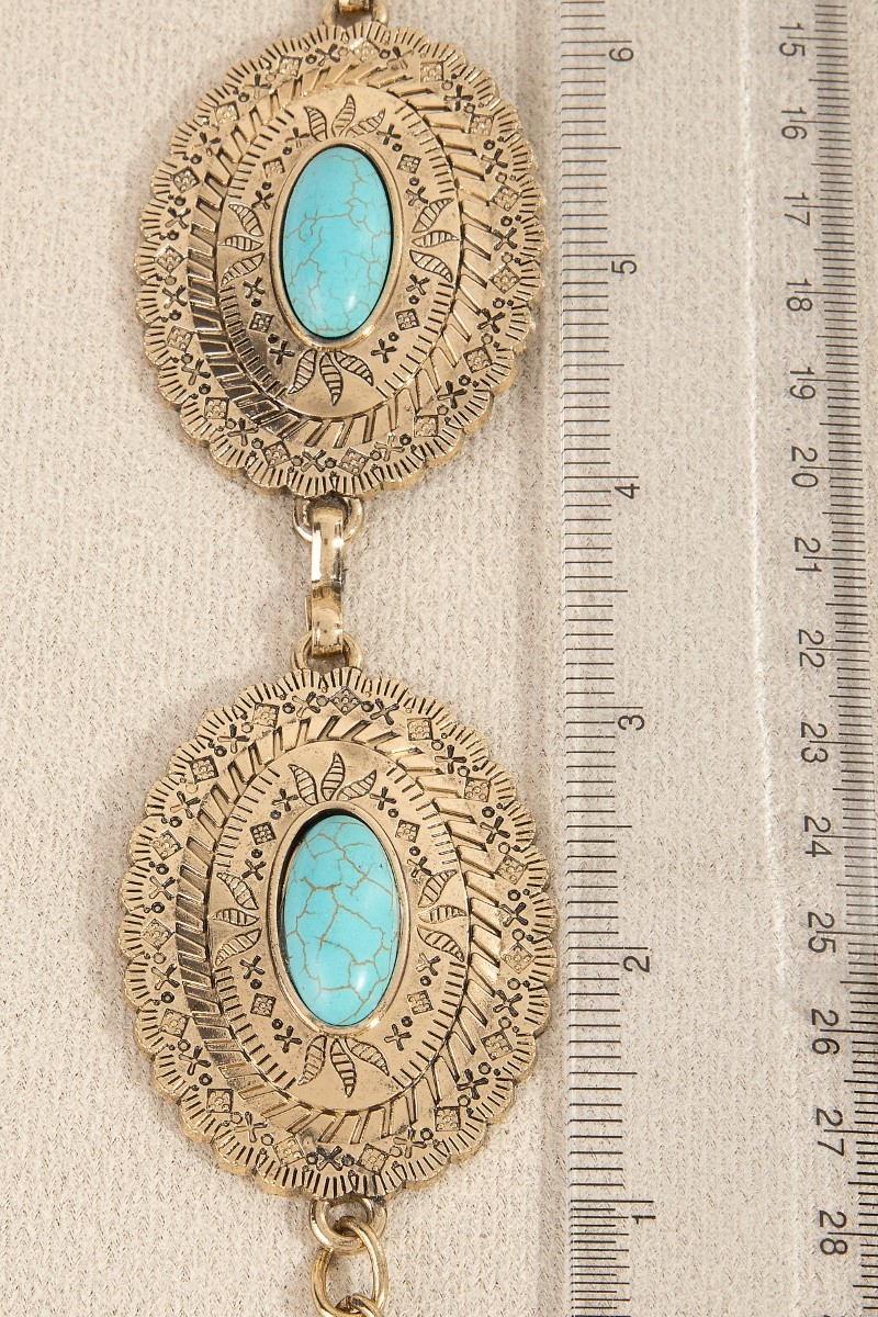 - This chain belt adds a modern oval turquoise concho disc style. Witness the perfect fusion of style and functionality as this chain belt effortlessly complements your lifestyle.