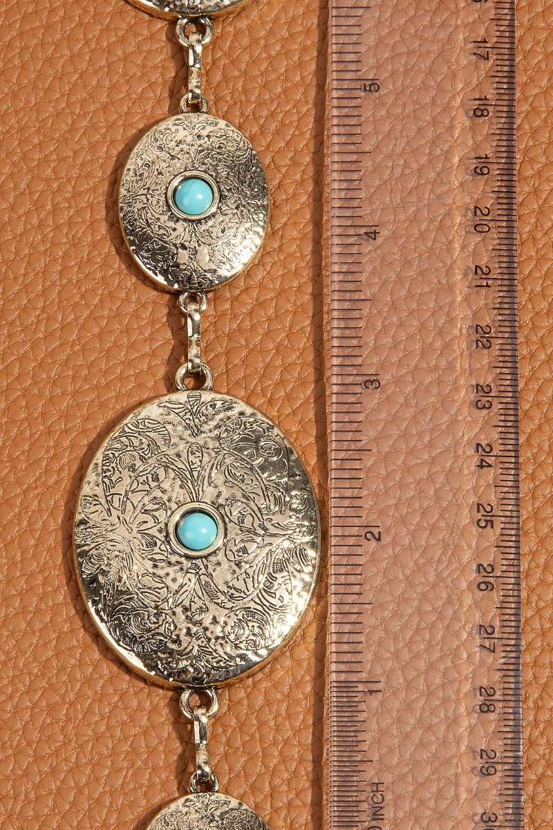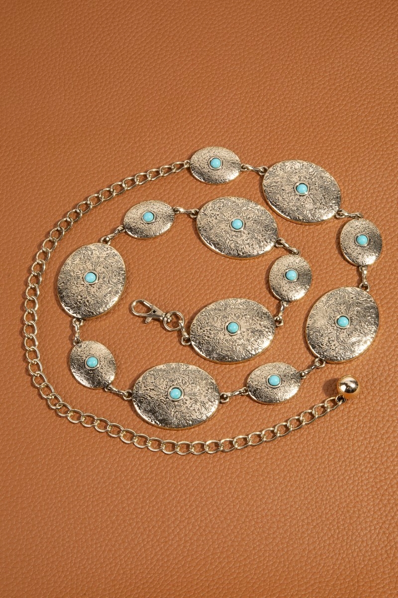 - This chain belt displays a vibrant textured engraved western concho style. Revel in the intricate design that effortlessly distinguishes this chain belt, making it a statement piece.