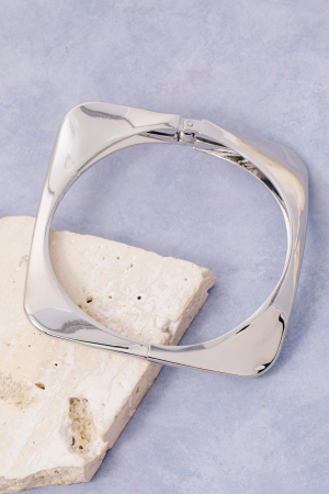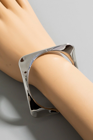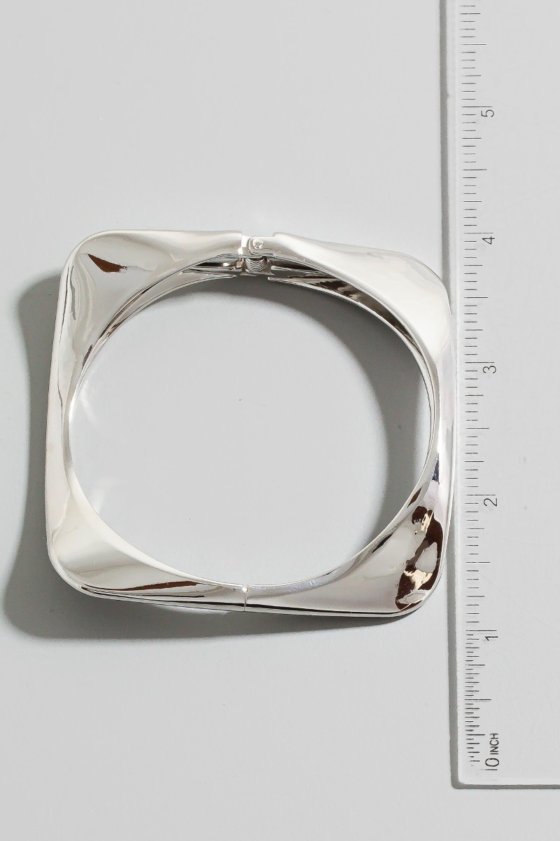- This bracelet introduces a unique silver metallic square hinge style. Celebrate the art of accessorizing with this piece that effortlessly encapsulates modern trends.