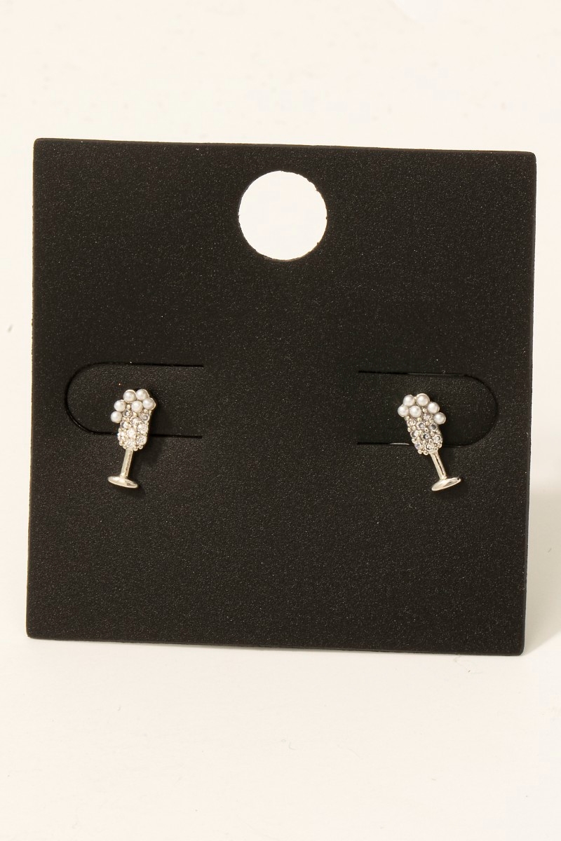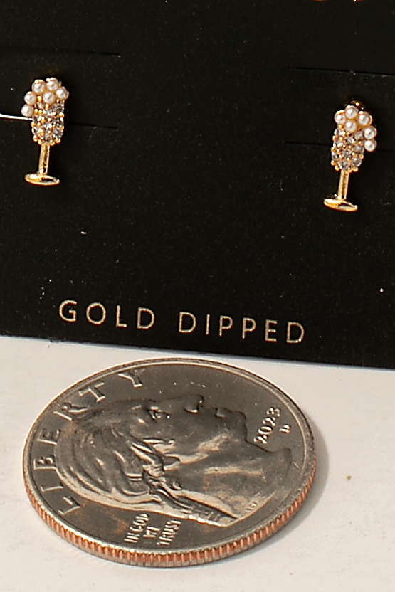 • This pair of stud earrings showcases a unique gold dipped cubic zirconia and pearl champagne glass style. Explore a blend of classic charm and contemporary flair.