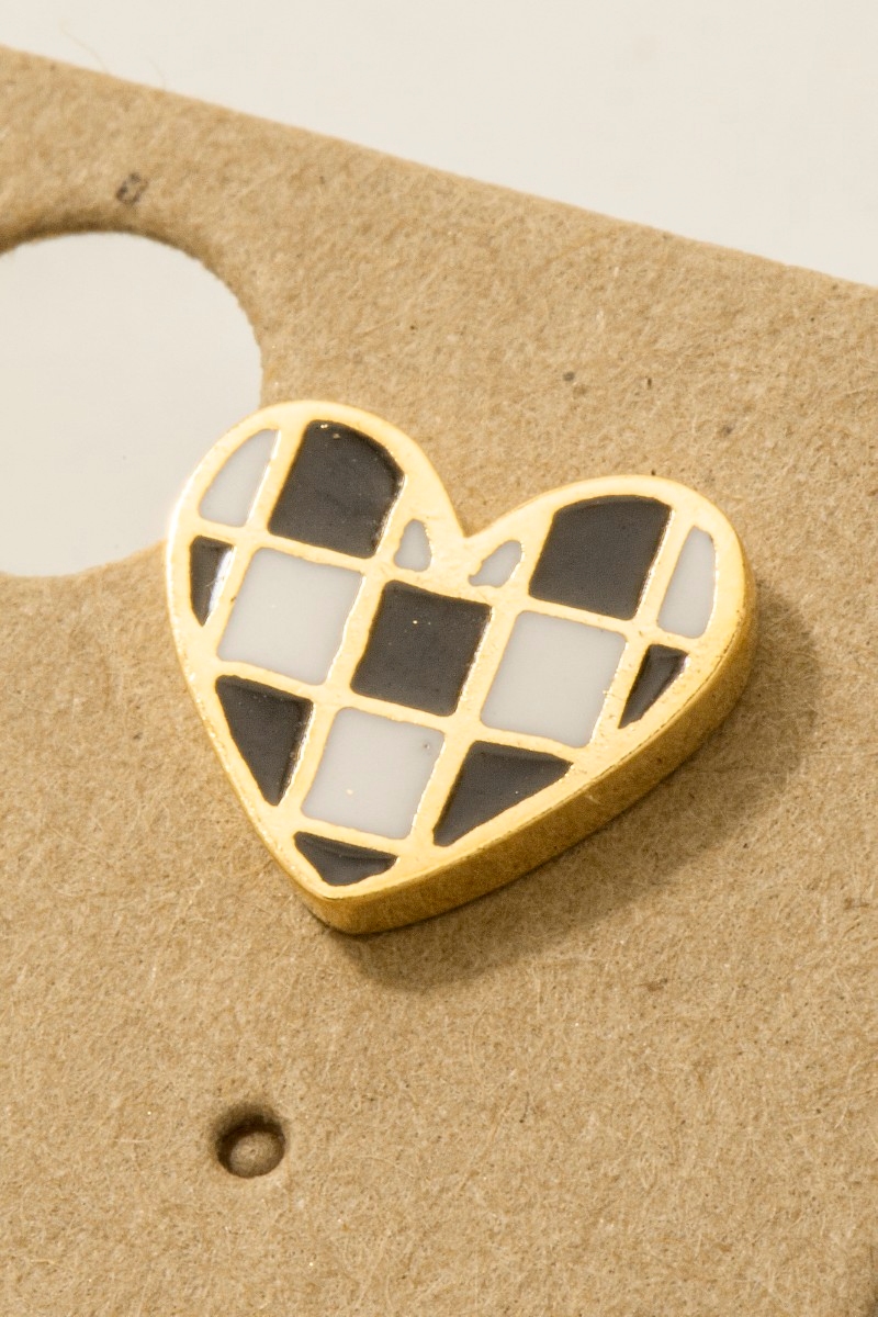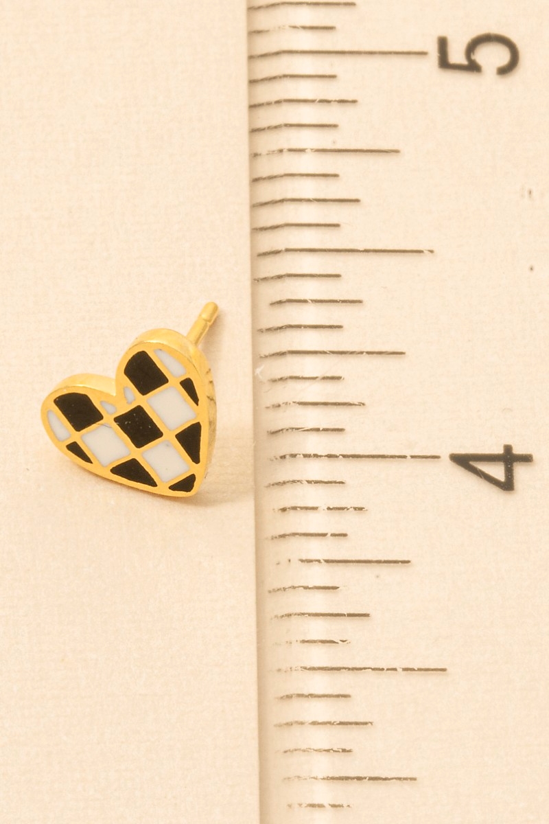 • This trending pair of earrings displays a fashionable gold dipped epoxy checkered heart stud earrings style. Celebrate individuality with this trending pair of earrings that effortlessly expresses your unique sense of style.