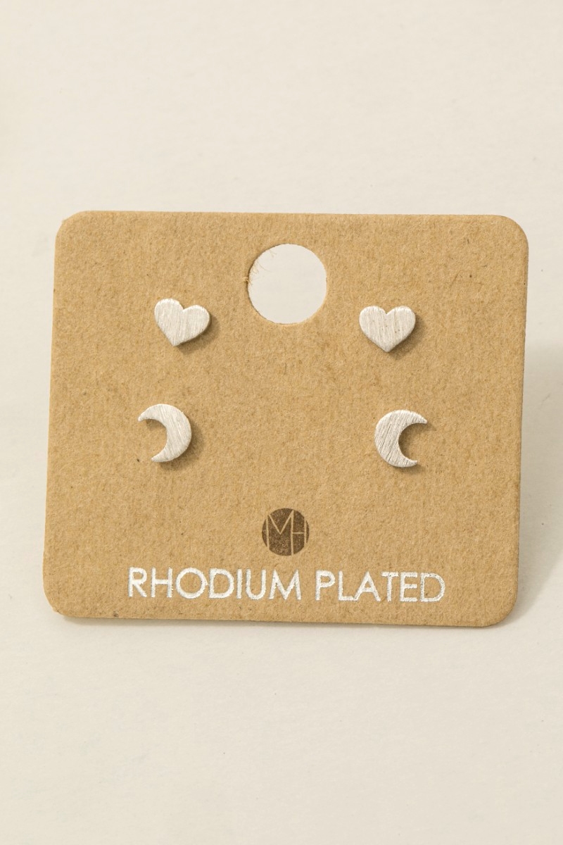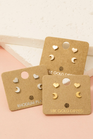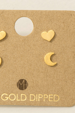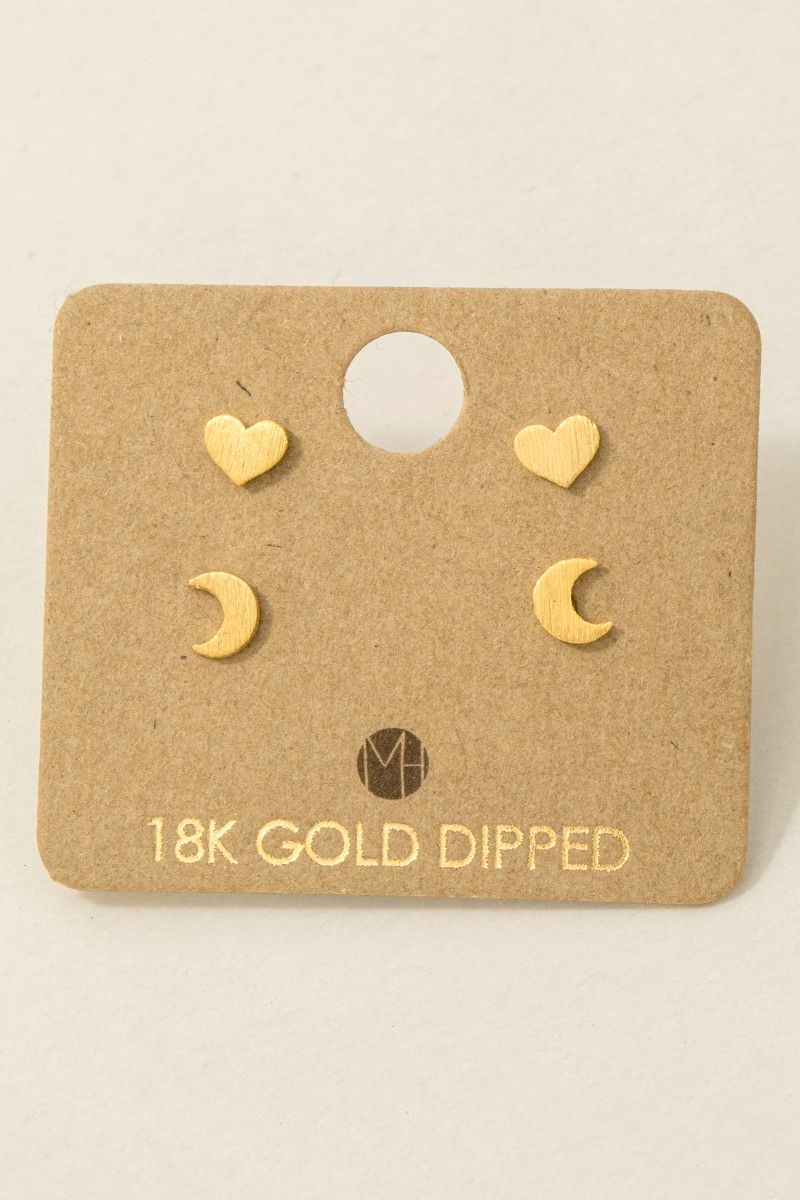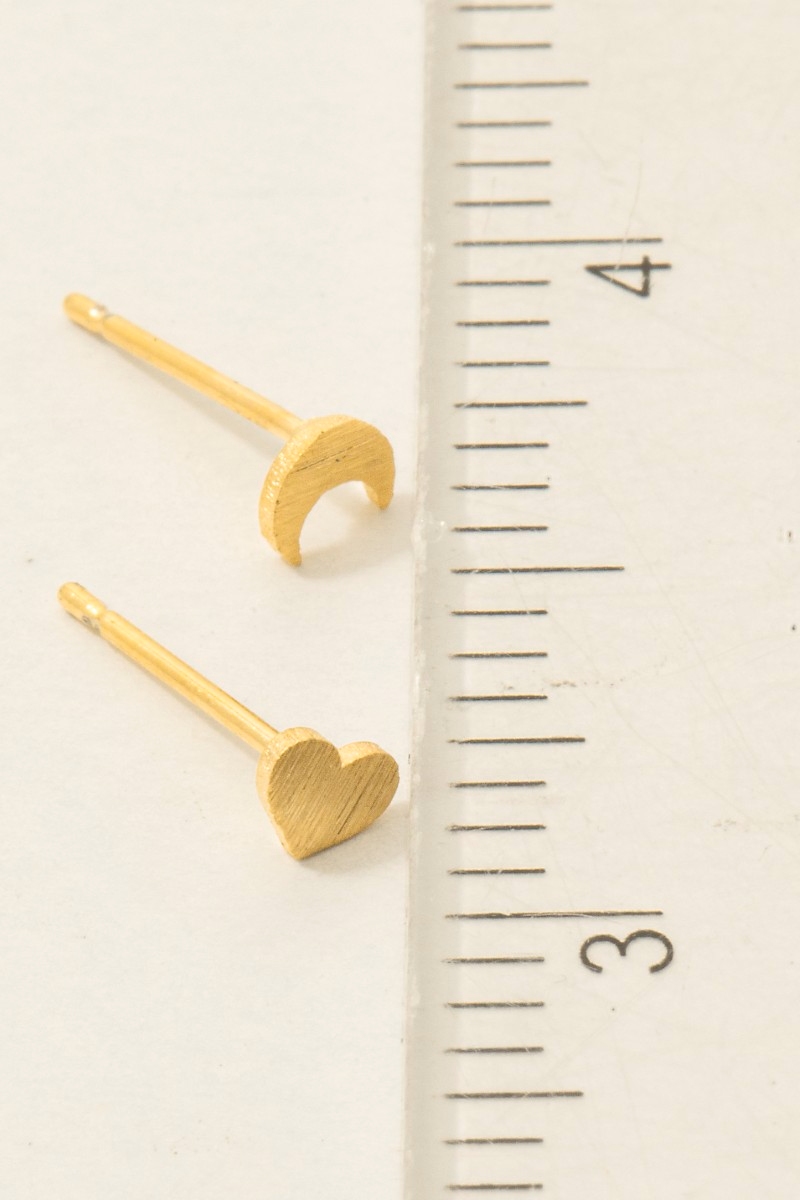 • This pair of earrings displays a fashionable gold dipped mini heart and moon stud earring set style. Savor the craftsmanship that goes beyond the ordinary, as this pair of earrings effortlessly captivates attention.