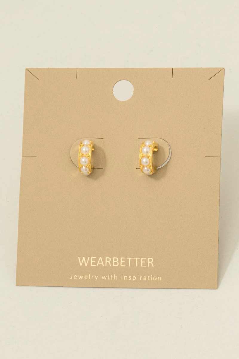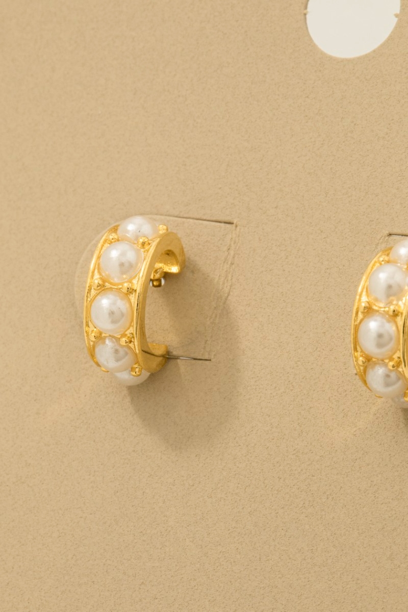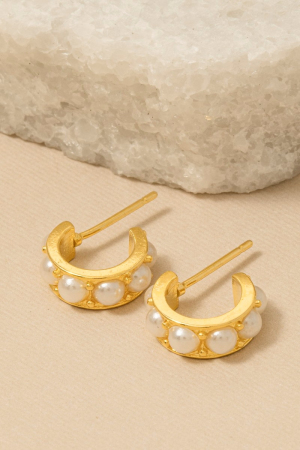 • This pair of hoop earrings brings a unique mini pearl studded post style. Elevate your ensemble with this pair of hoop earrings that effortlessly captures the essence of refined fashion.