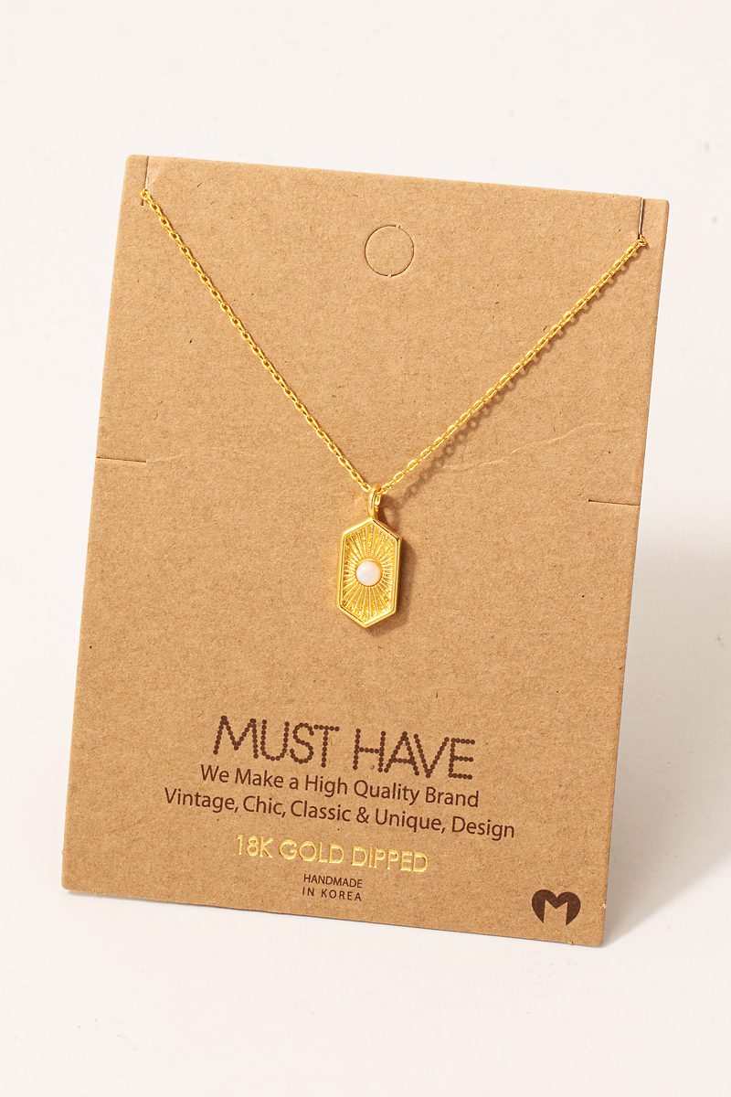 • This necklace showcases a timeless gold dipped ornate opal studded hexagon pendant style. Discover the perfect balance of functionality and fashion.