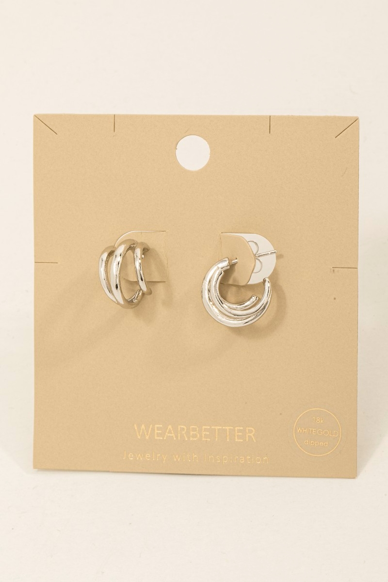 • This pair of hoop earrings introduces a unique mini three layered style. Redefine your look effortlessly with this standout, on-trend piece.