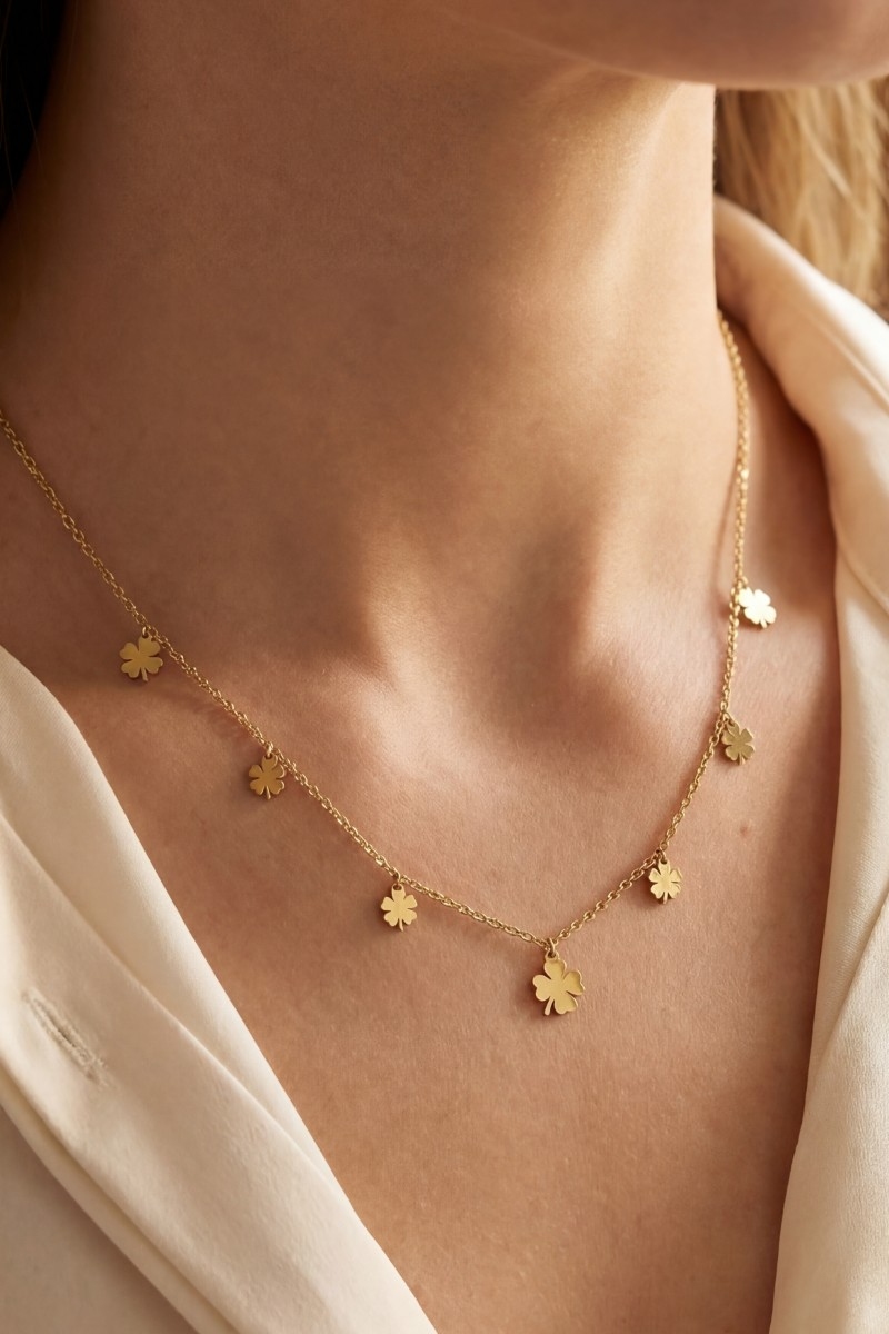 - This chain necklace introduces a stunning stainless steel clover charms station necklace style. Experience a subtle blend of modernity and classic charm as this chain necklace effortlessly adorns your ensemble.