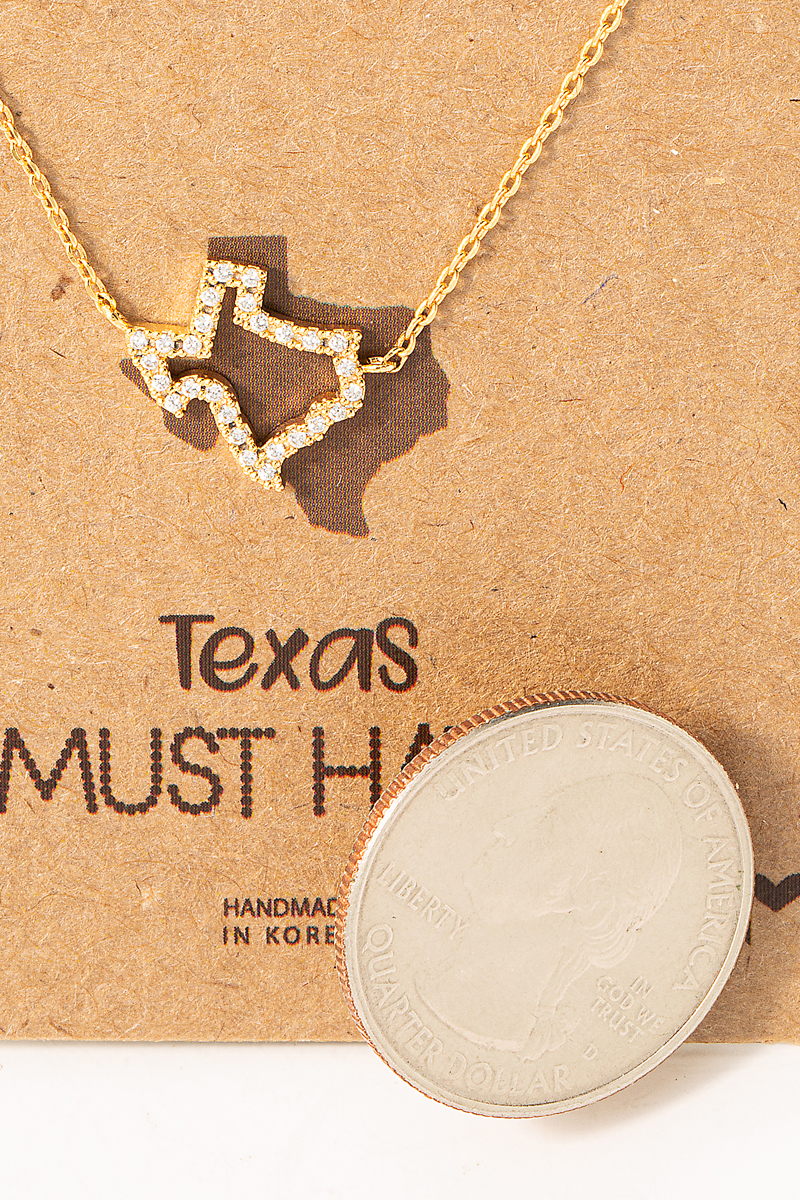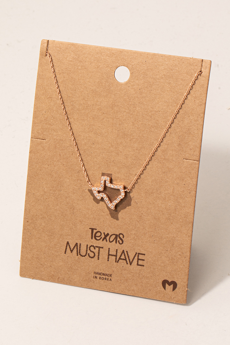 • This necklace showcases a unique rhinestone trim texas state pendant style. Explore a blend of classic charm and contemporary flair.