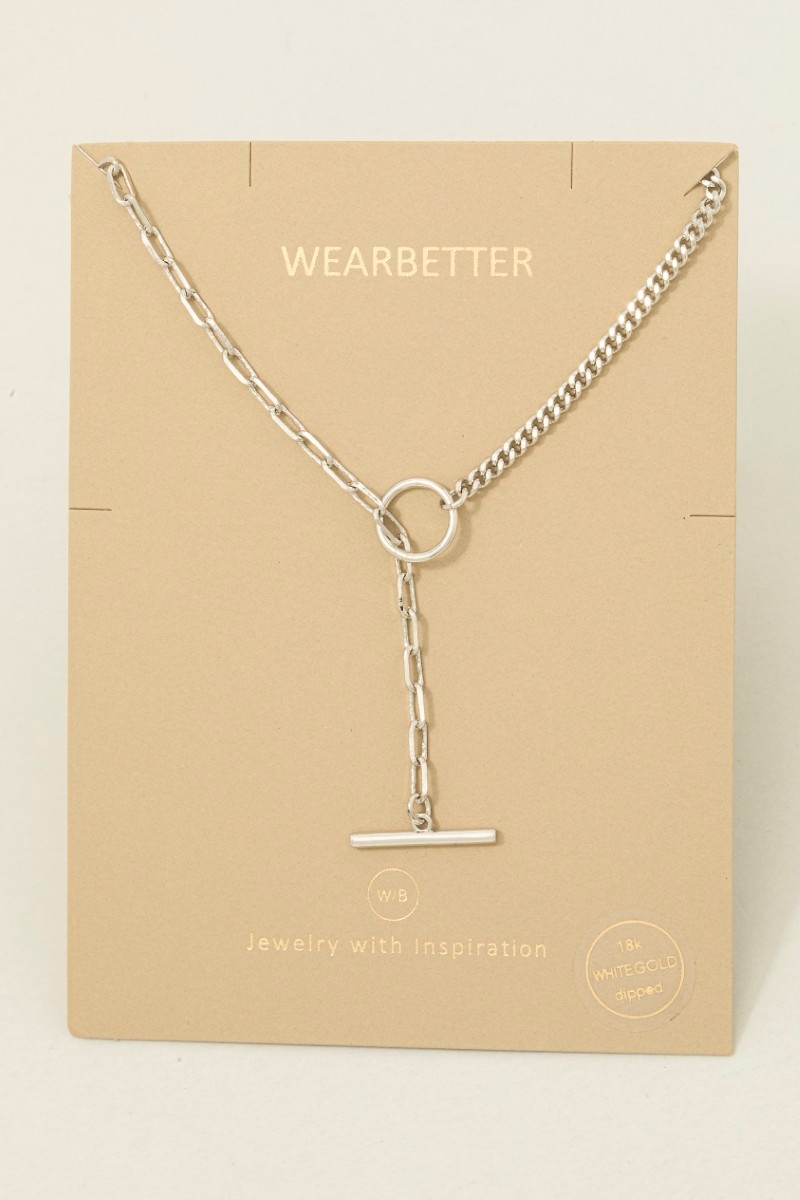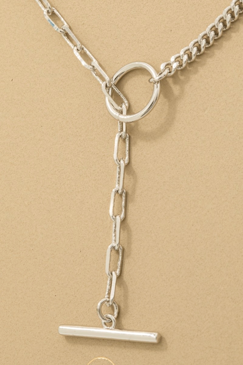• This chain necklace showcases a unique toggle chain y necklace style. Step into a world of refined taste as this chain necklace effortlessly refines the details of your outfit.