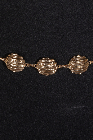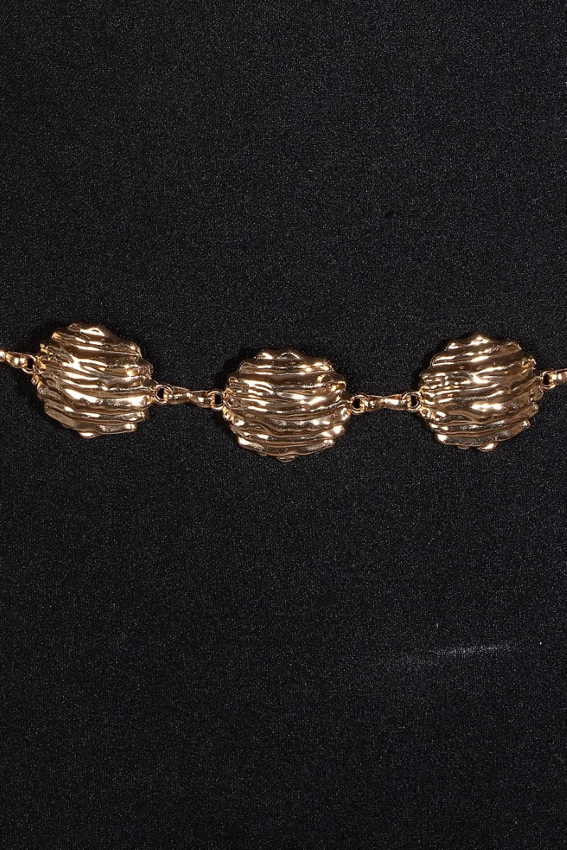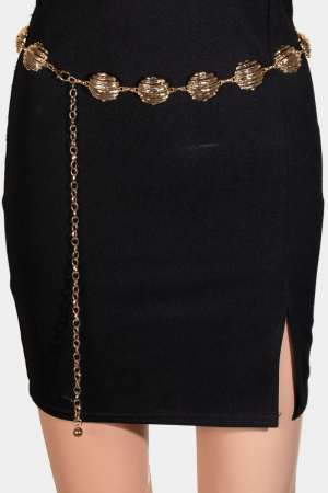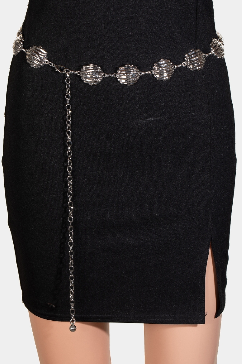 - This chain belt introduces a unique warped metallic disc style. Explore a refined sense of style with this chain belt, seamlessly elevating the chic factor of your look.