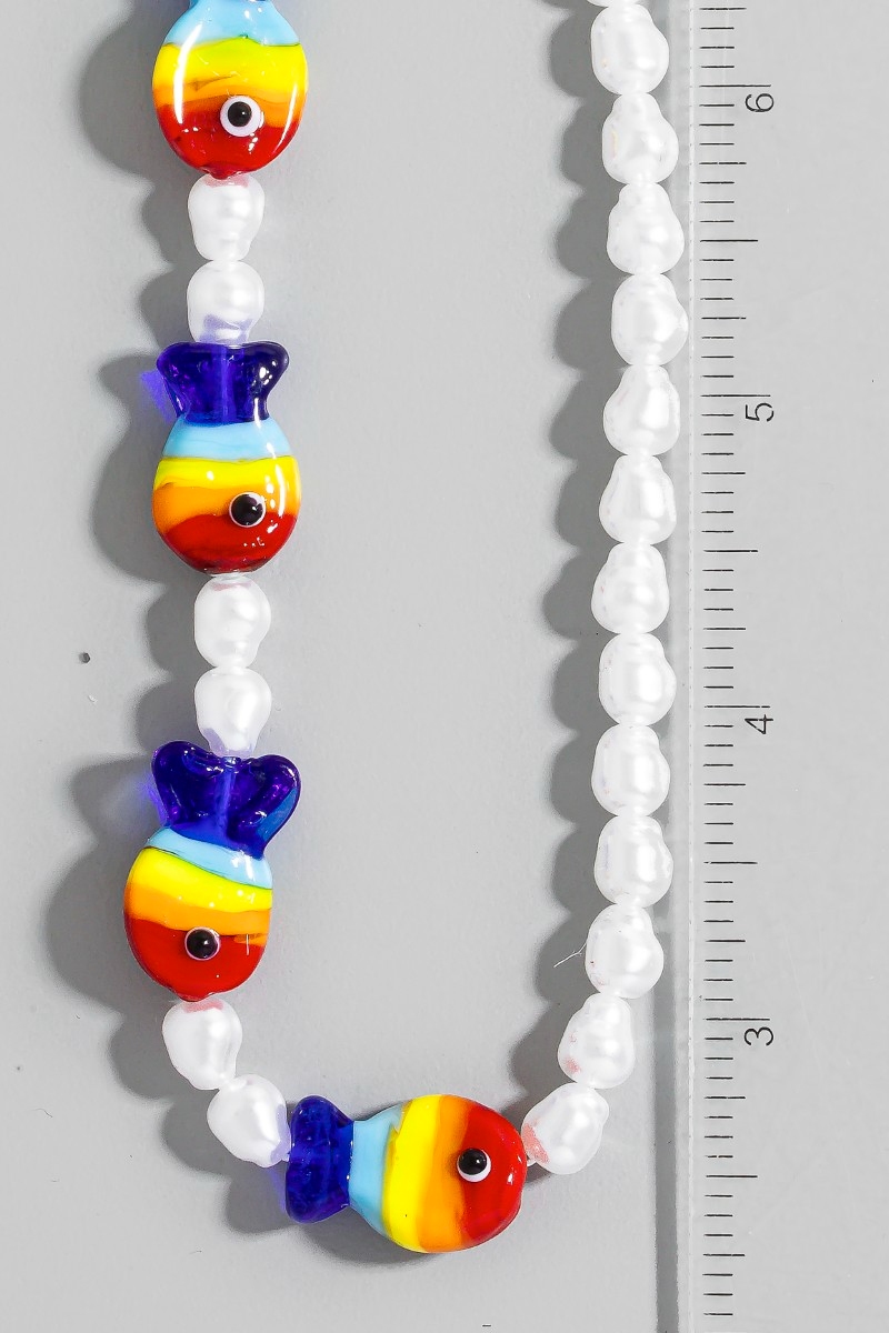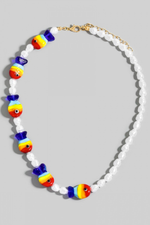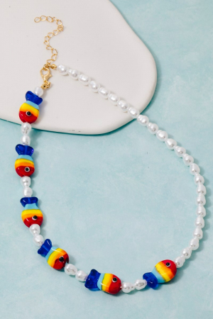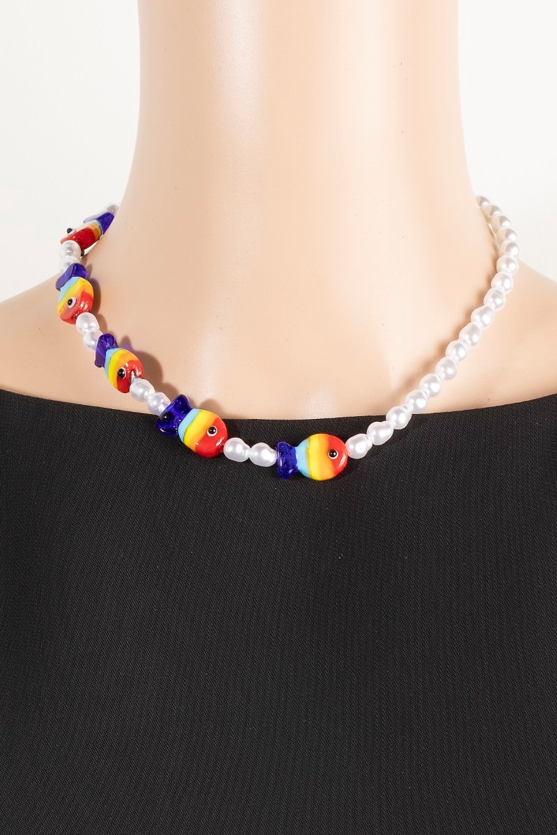 - This necklace displays a fashionable pearl and rainbow fish beads style. Delight in the intricate details that make this necklace an essential element in expressing your fashion identity.