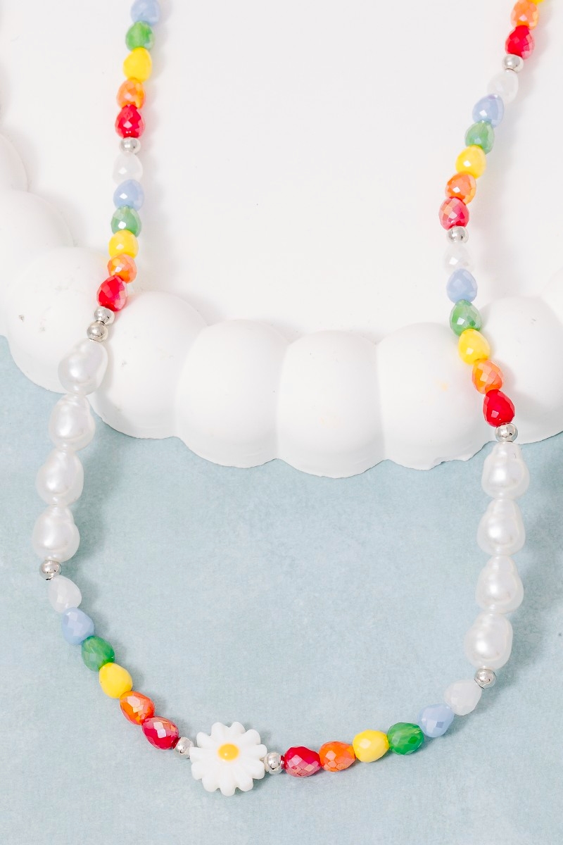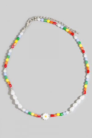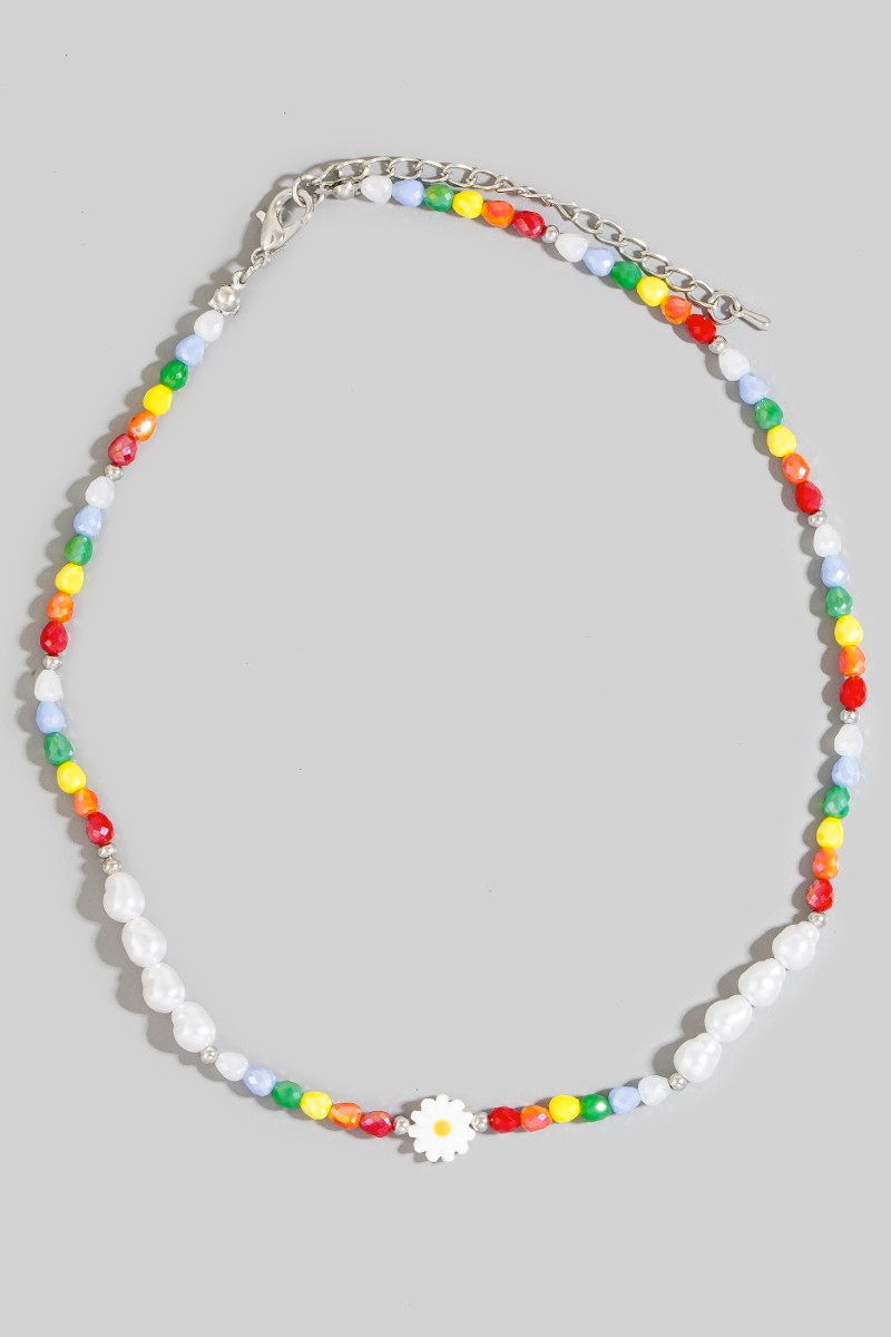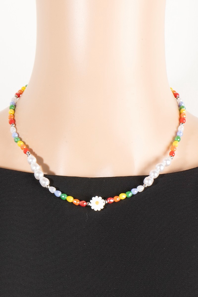 - This necklace showcases a unique multi color beaded flower style. Explore a refined sense of style with this necklace, seamlessly elevating the chic factor of your look.