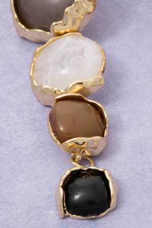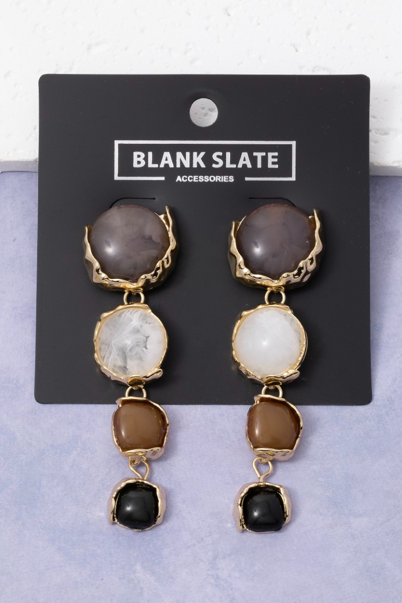 • This pair of dangle earrings brings a luxurious marble resin and metallic discs tiered style. Elevate your ensemble with this pair of dangle earrings that effortlessly captures the essence of refined fashion.