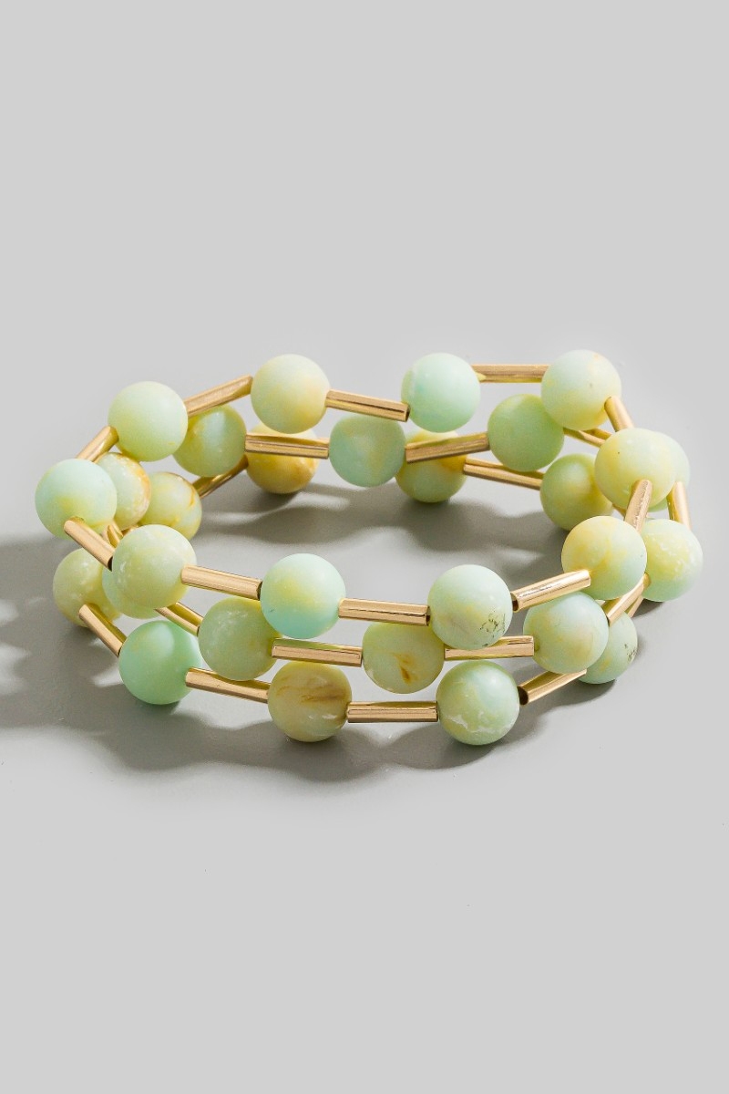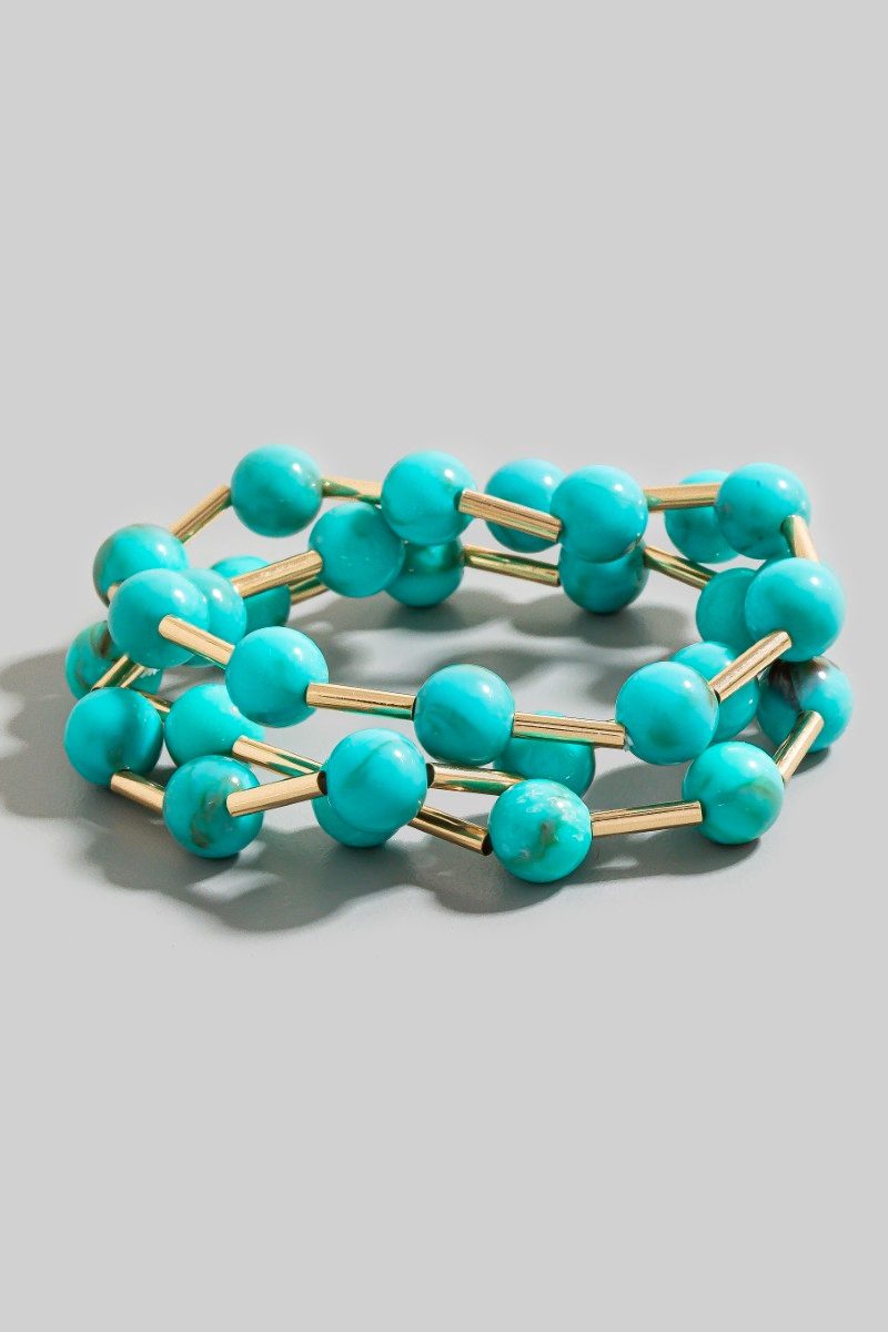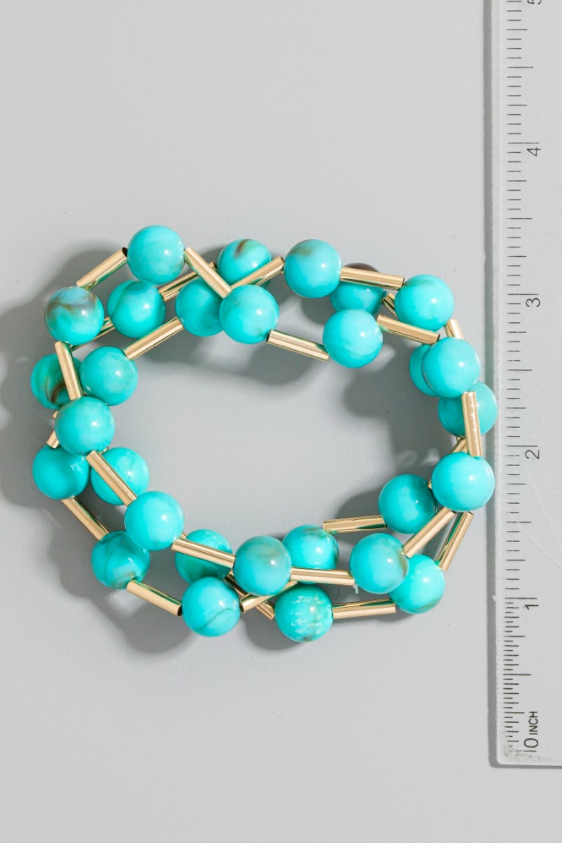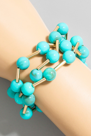 • This bracelet features a fashionable metallic bars and ball resin beads style. Experience a subtle blend of modernity and classic charm as this bracelet effortlessly adorns your ensemble.