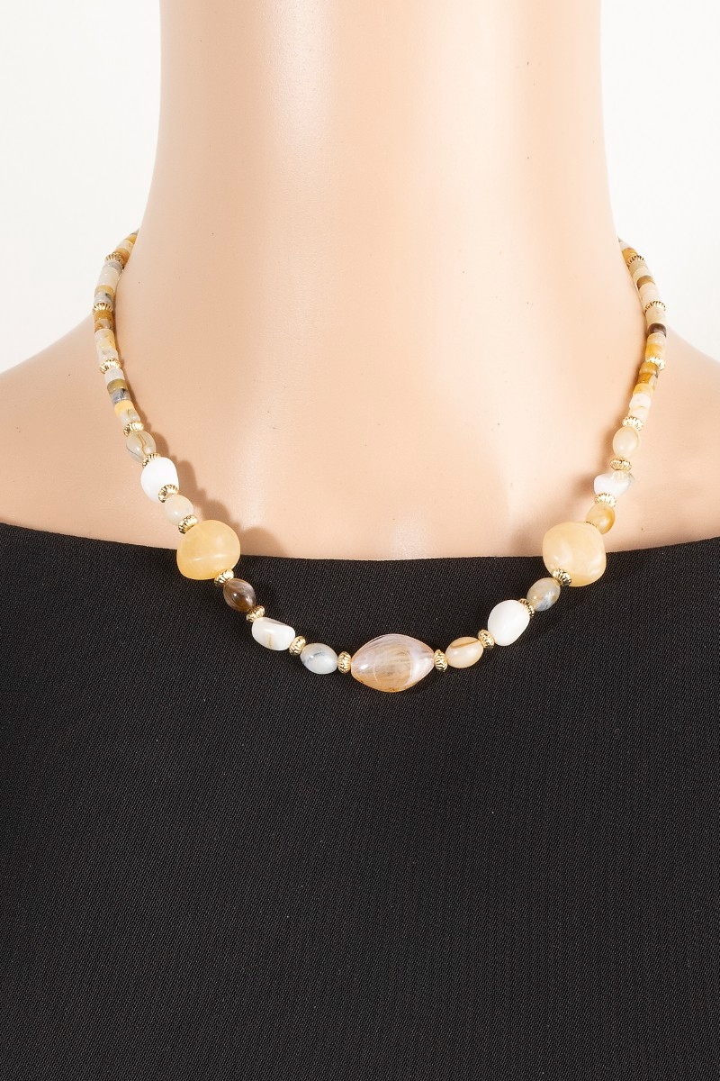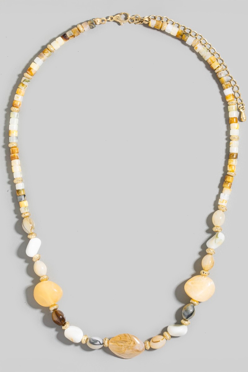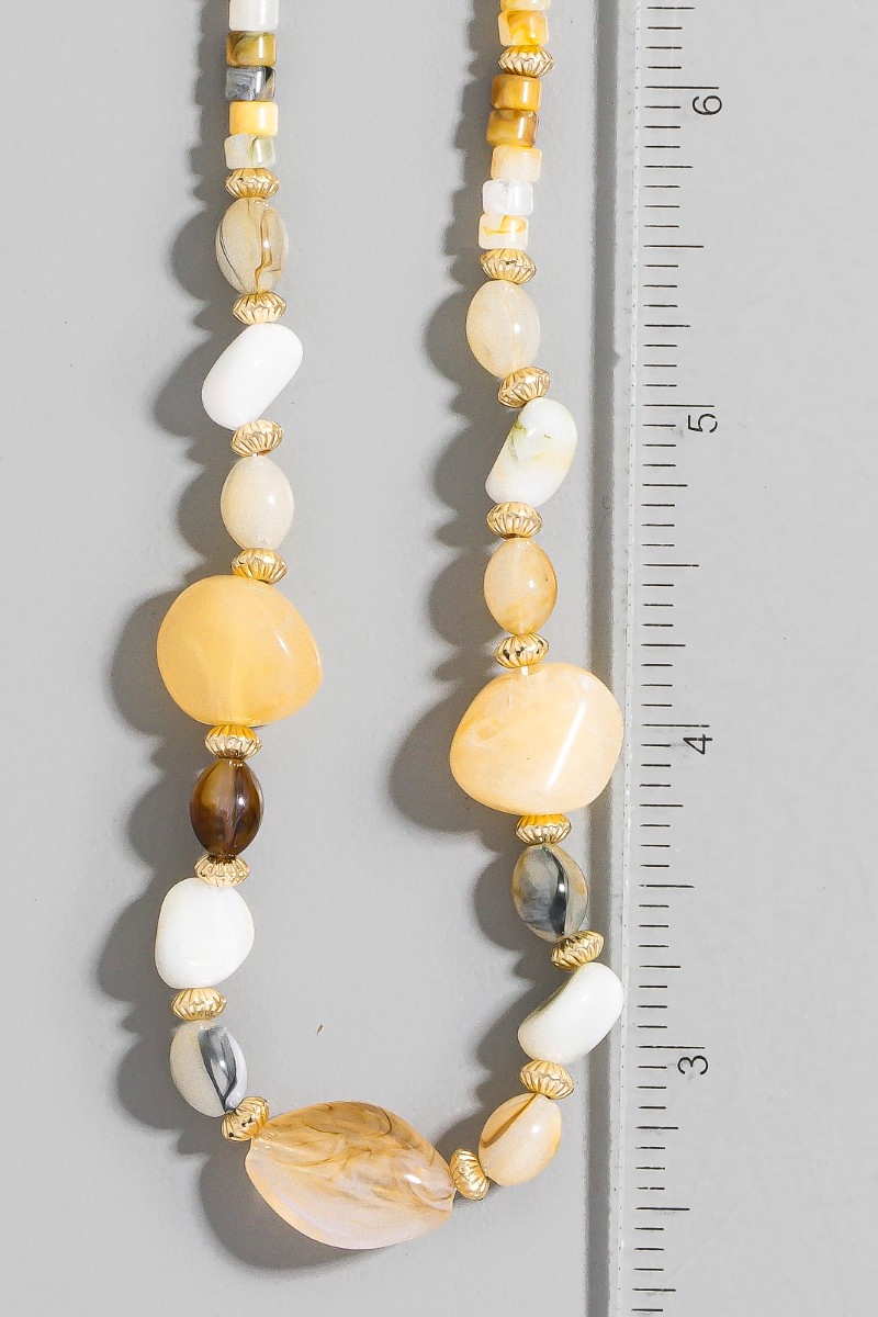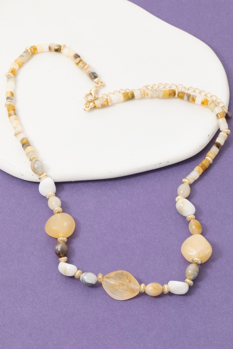 - This necklace features a fashionable mixed irregular earth tones resin beaded style. Experience refined sophistication with this understated yet stylish piece.
